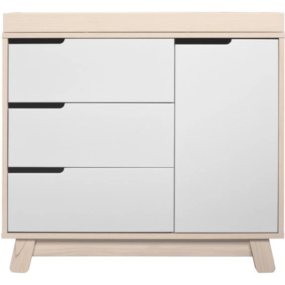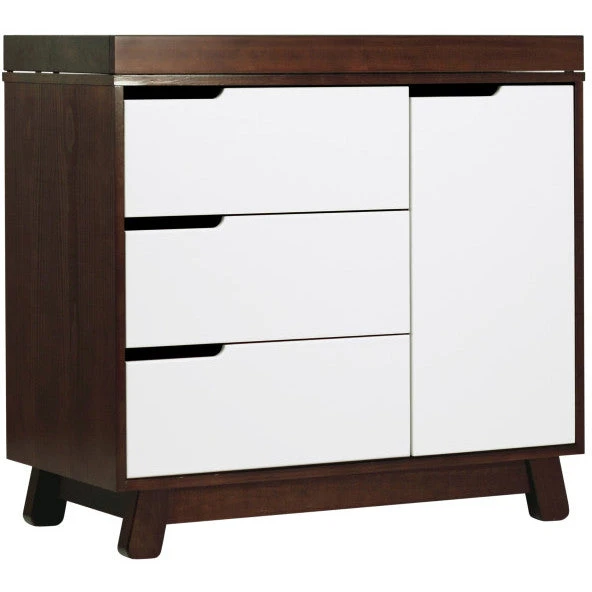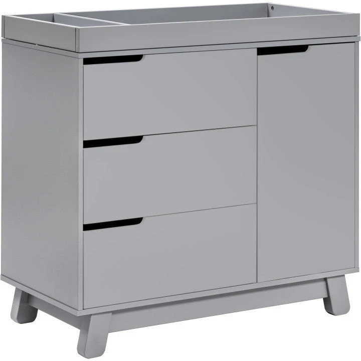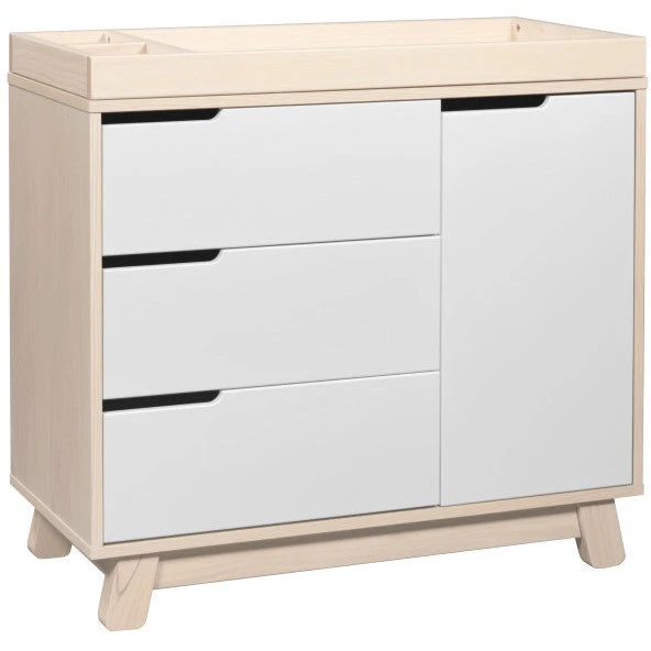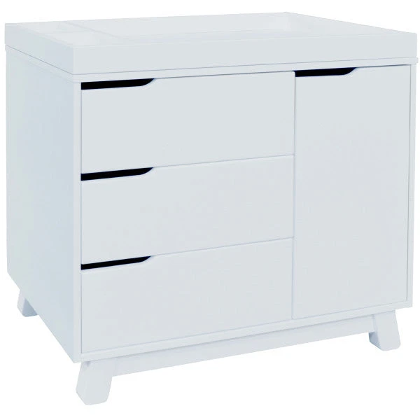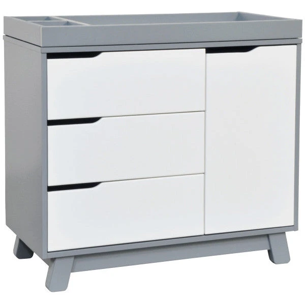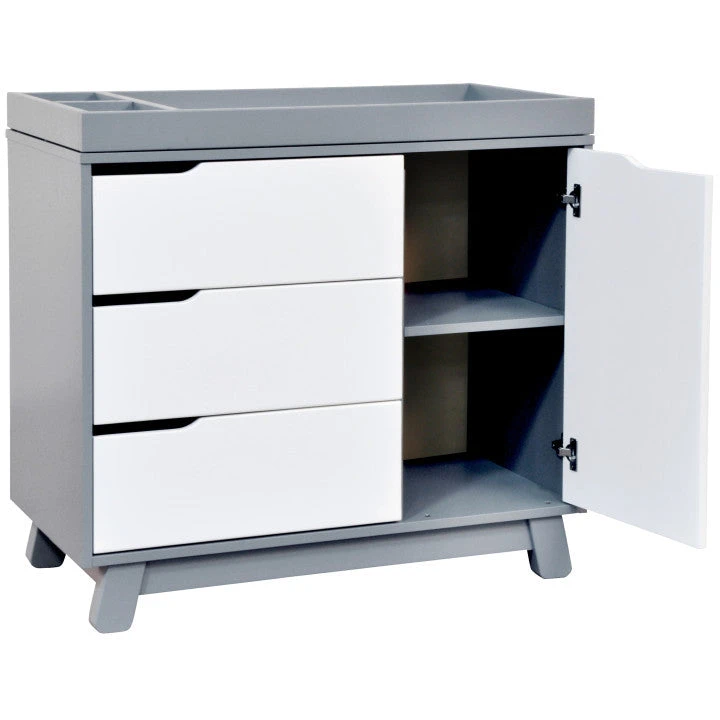 Get more from your nursery furniture with the versatile Hudson Changer Dresser. Combining a changing table, three drawer dresser, and storage cabinet all in one solid and practical package, the Hudson Changer Dresser is a modern space-saving convenience. Complementing the mid-century modern-inspired Hudson 3-in-1 Convertible Crib, the dresser comes in three chic finishes including two new takes on two-tone for the nursery. Truly built for baby, the removable changer tray’s raised sides help keep your little one safe, and an anti-tip kit is included for further security. Keep baby’s clothes and necessities organized in the smooth-opening drawers, while stop mechanisms prevent them from being pulled all of the way out. The storage cabinet closes gently and includes an adjustable shelf, perfect for keeping diapers and wipes handy.