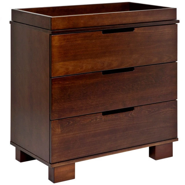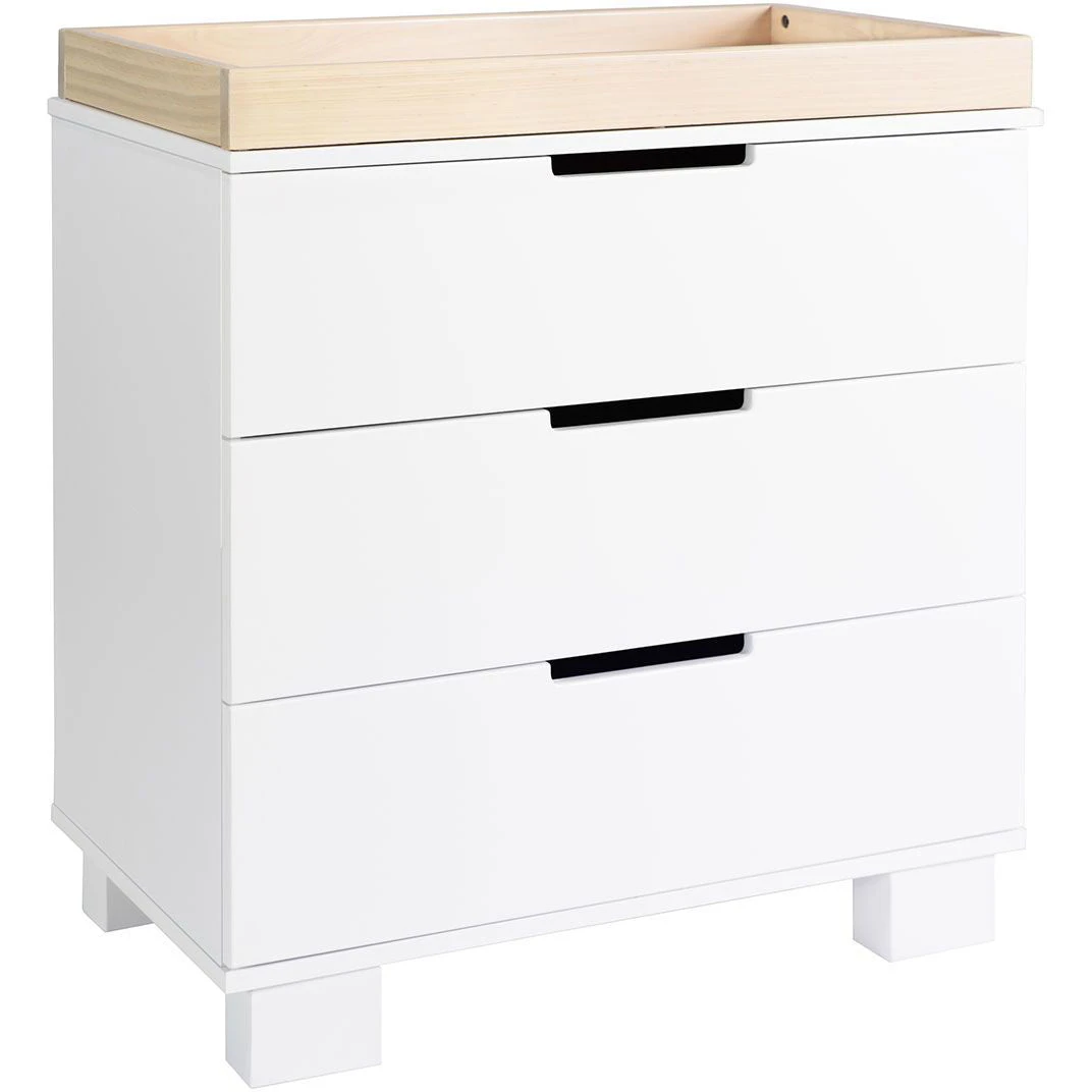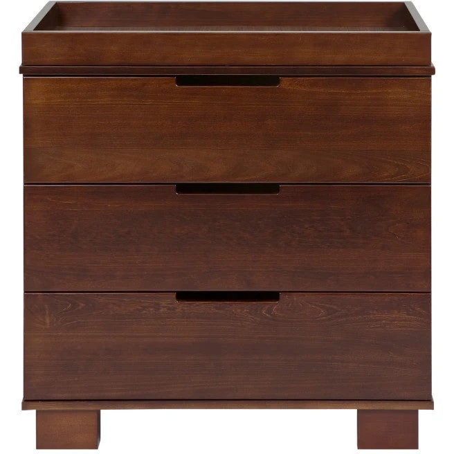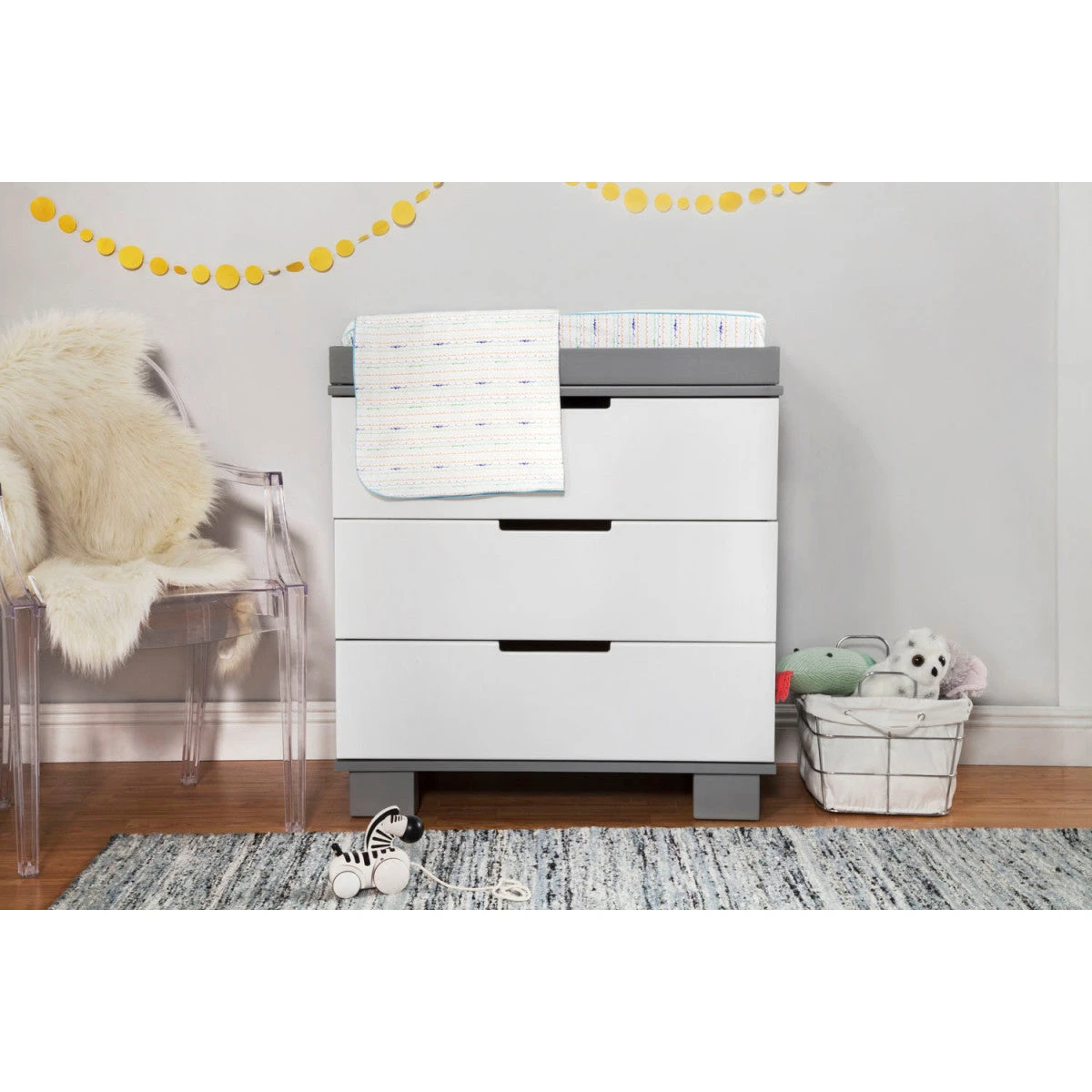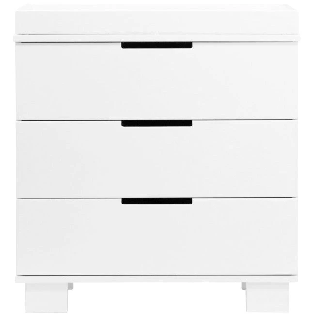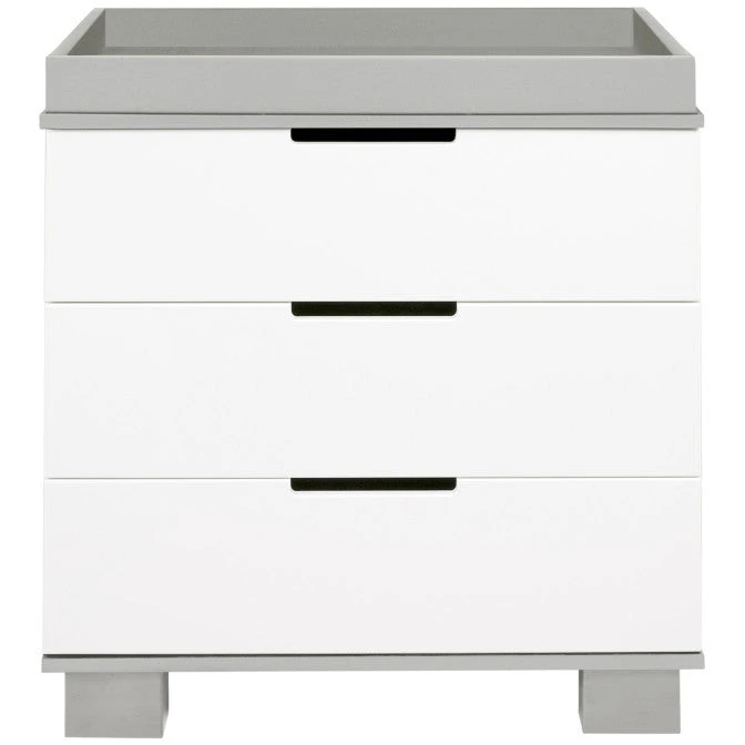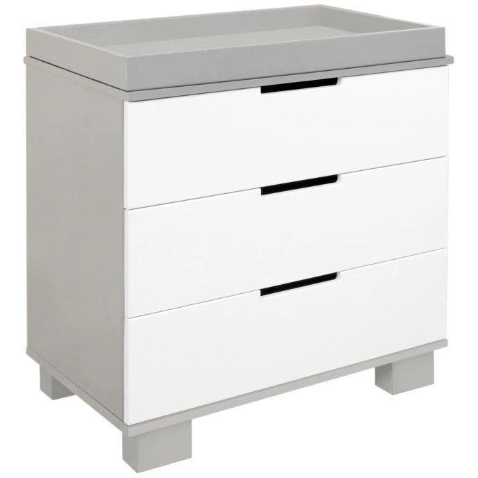 A changing table on top and a dresser just below, the modern Modo 3 Drawer Changer Dresser is a space-saving nursery necessity. Smart and stylish, the sleek design of the Modo 3 Drawer Changer Dresser provides ample drawer storage space. Up top, the changing tray’s raised sides help keep baby safe. Once baby has grown out of using the changer it can be removed to leave a chic dresser. The drawers smoothly and gently slide open thanks to metal glide hardware. Stop mechanisms on the drawers keep baby safe by ensuring drawers can’t be pulled all the way out. The changer dresser also includes an anti-tip kit to further enhance safety by attaching the dresser to the wall. The Modo 3 Drawer Changer Dresser matches the modern Harlow, Modo and Mercer convertible cribs, and the portable Origami Mini Crib.