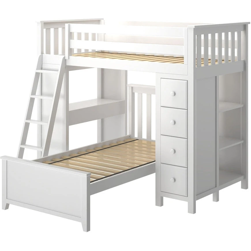Sleep/Study/Storage Solution – Twin loft with built-in storage towers combine desk & 4 roomy front-facing drawers with 3 book shelves behind it. Twin Bed fits L-Shaped under Loft. Solid knot free Pine construction with flush, color coordinated hardware creates a clean & modern look. Oversized steel hardware ensures solid connections. Each bed tested for 400lb to comfortably sleep kids or adults. Pre-assembled components for fast & easy assembly. 15″ guardrails accommodate standard mattresses (slat rolls included). Recommended for 8 feet ceiling height above. This bed meets or exceeds federal safety standards. Mattress, Cork board for desk & Bedside tray sold separately.