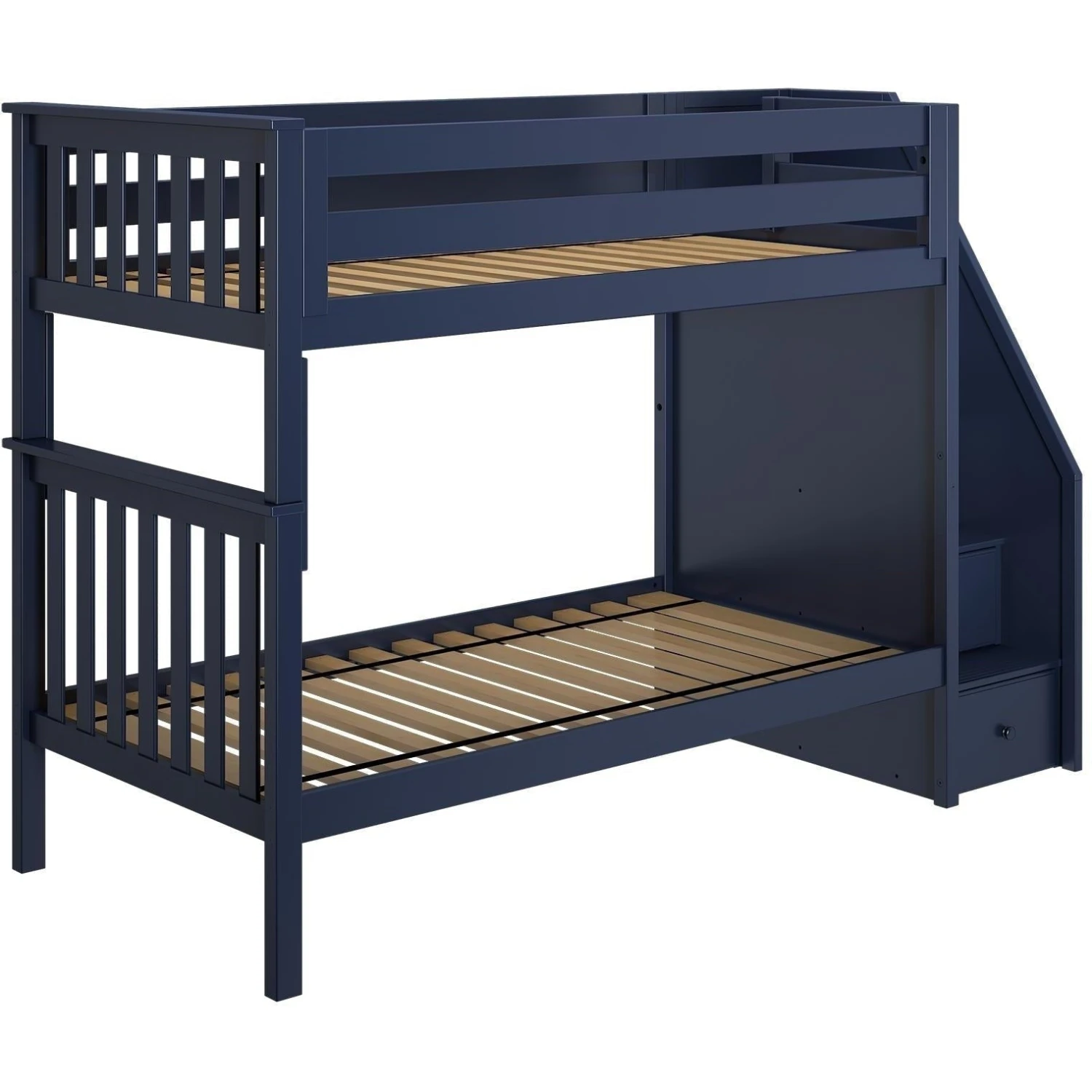 Staircase bunk with built-in storage drawers with dovetail drawer construction & soft close mechanism. Solid knot free Pine construction with flush, color coordinated hardware creates a clean & modern look. Oversized steel hardware ensures solid connections. Pre-assembled components for fast & easy assembly. Top/bottom slat rolls included – no bunkie board required. Each bed tested for 400lb to comfortably sleep kids or adults. With tall 15″ guardrails the bed safely accommodates standard size mattresses. Reversible staircase offers plenty of storage & safe entry. Extra deep bottom drawer (30”)! Recommended for 8 feet ceiling height above. Meets or exceeds federal safety standards. Mattresses, Trundles, Storage Drawers & Vanity panels sold separately.