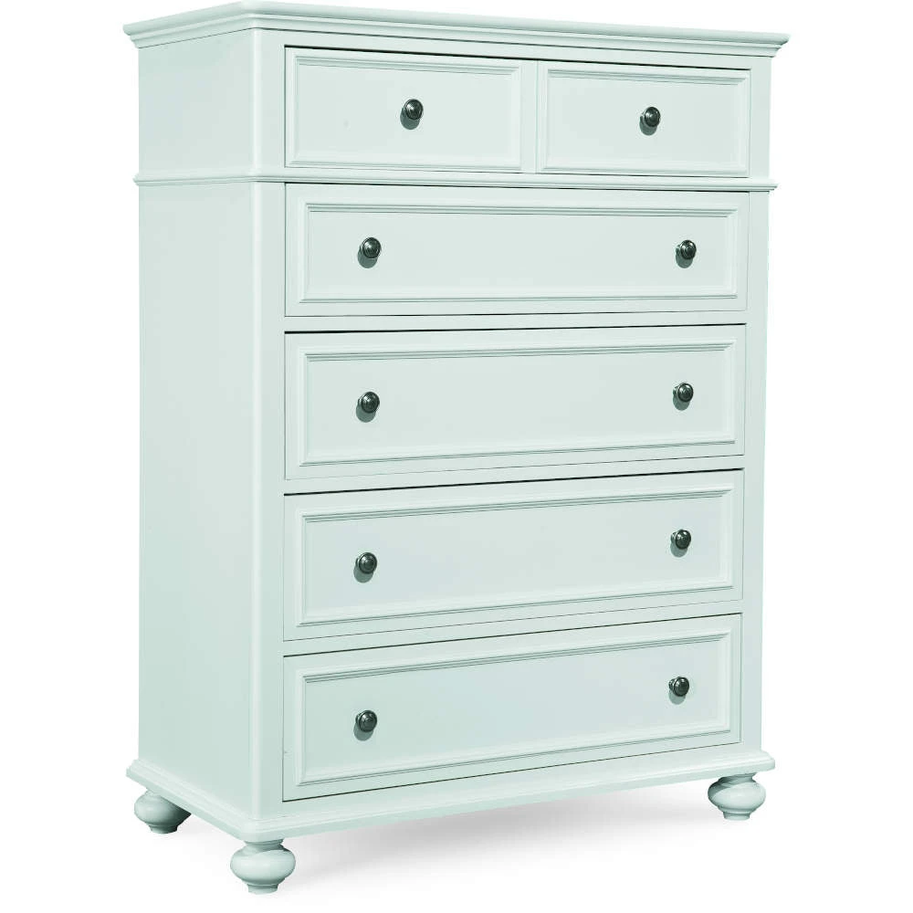 - Offers 5 storage drawers (a large top drawer gives the appearance of 2 drawers). Framed drawers, waist molding, and bun feet add simple detailing to this timeless style.