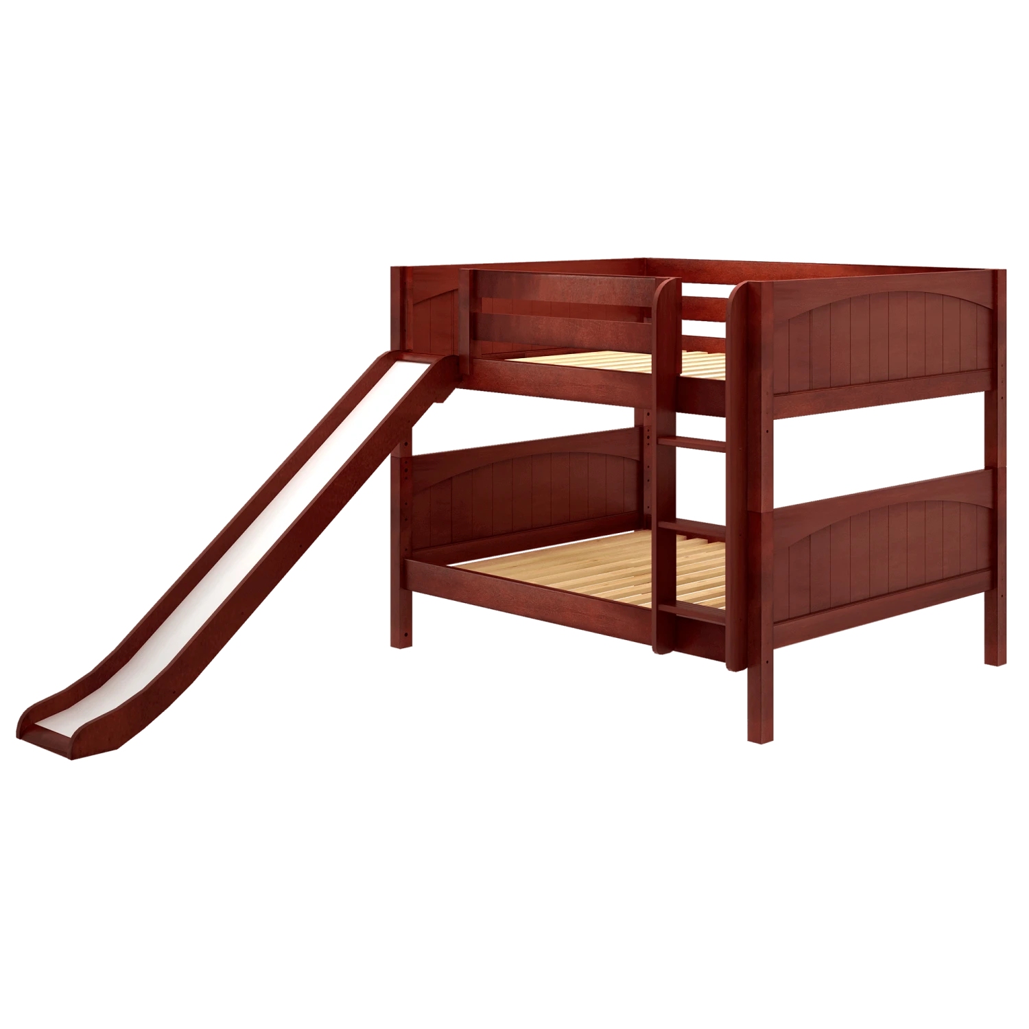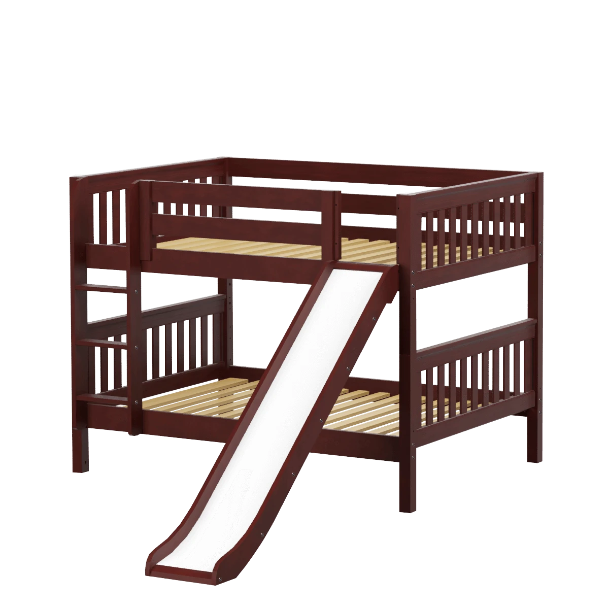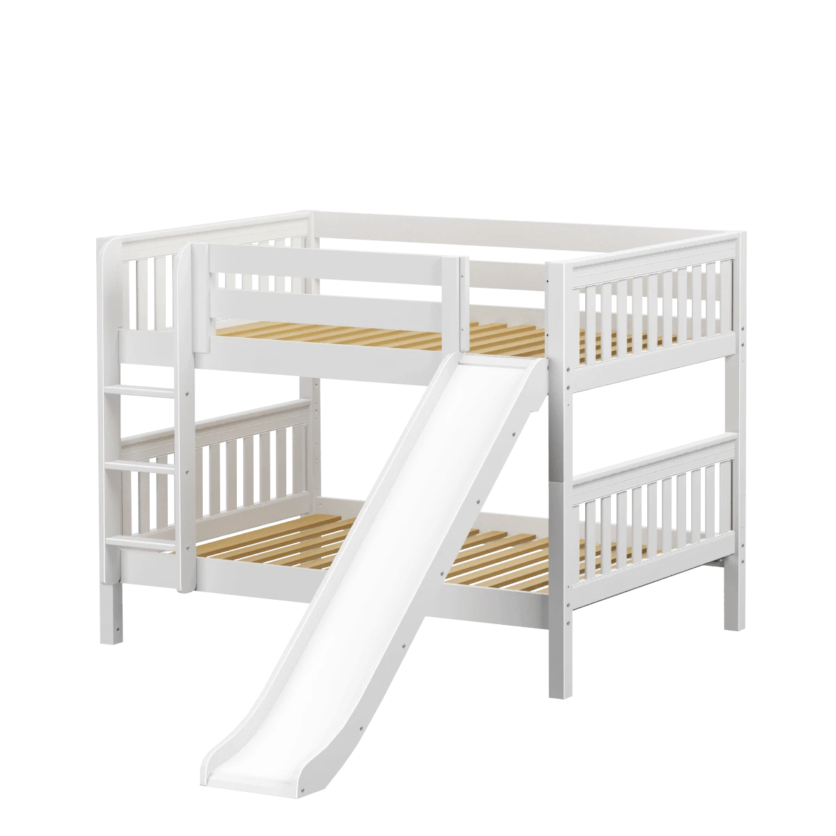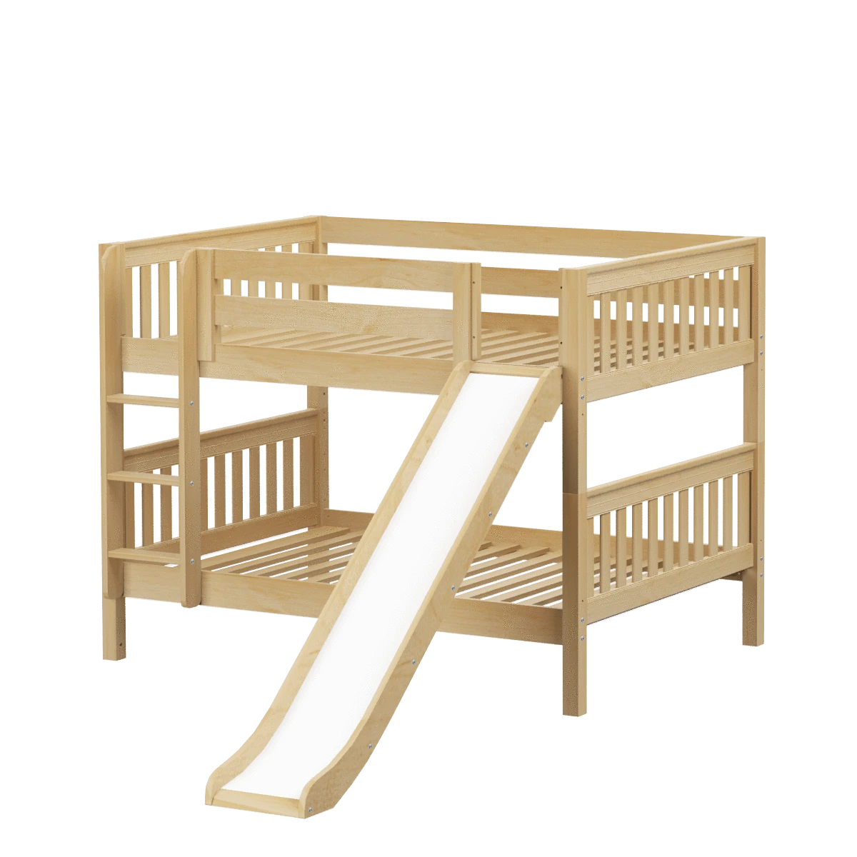 Our classic low bunk gets an extra dose of fun with the addition of a slide! Stacked design sleeps two comfortably – low height is perfect for small rooms and little ones. Full size = extra room for growing kids, sleepovers or snuggling with parents.