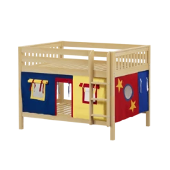Colorful curtains turn our classic low bunk into an adorable playhouse! Stacked design is a space-saving way to sleep two in one room. Straight ladder sits flush for a clean finish + easy trundle or storage drawer use. Full size = extra room for growing kids, sleepovers or snuggling with parents.