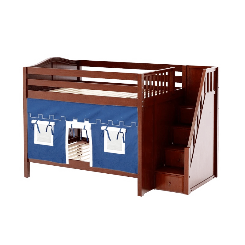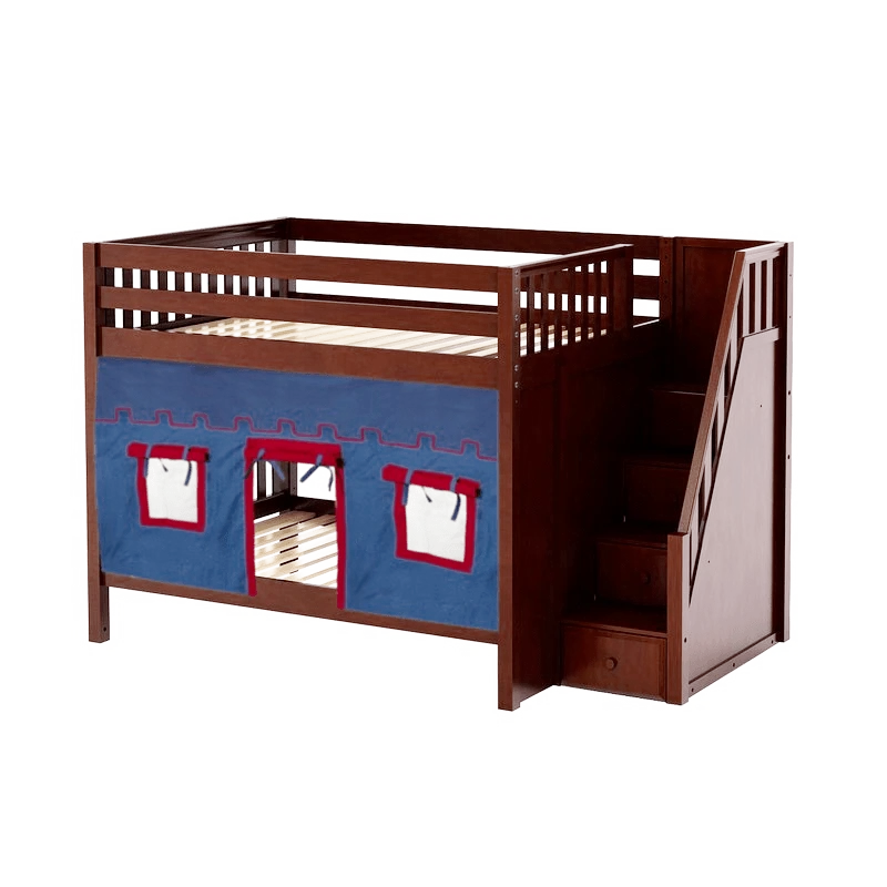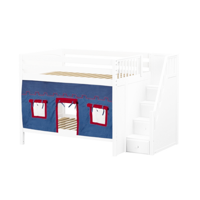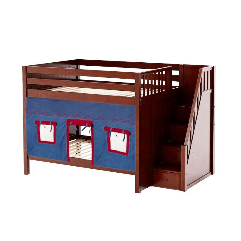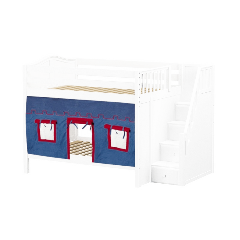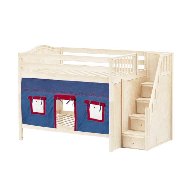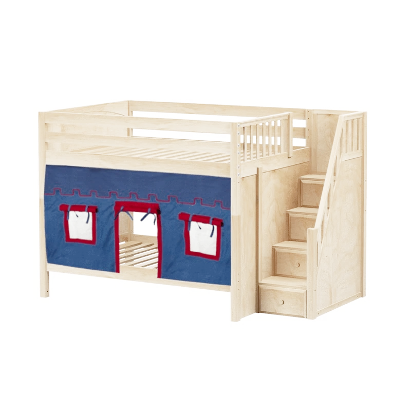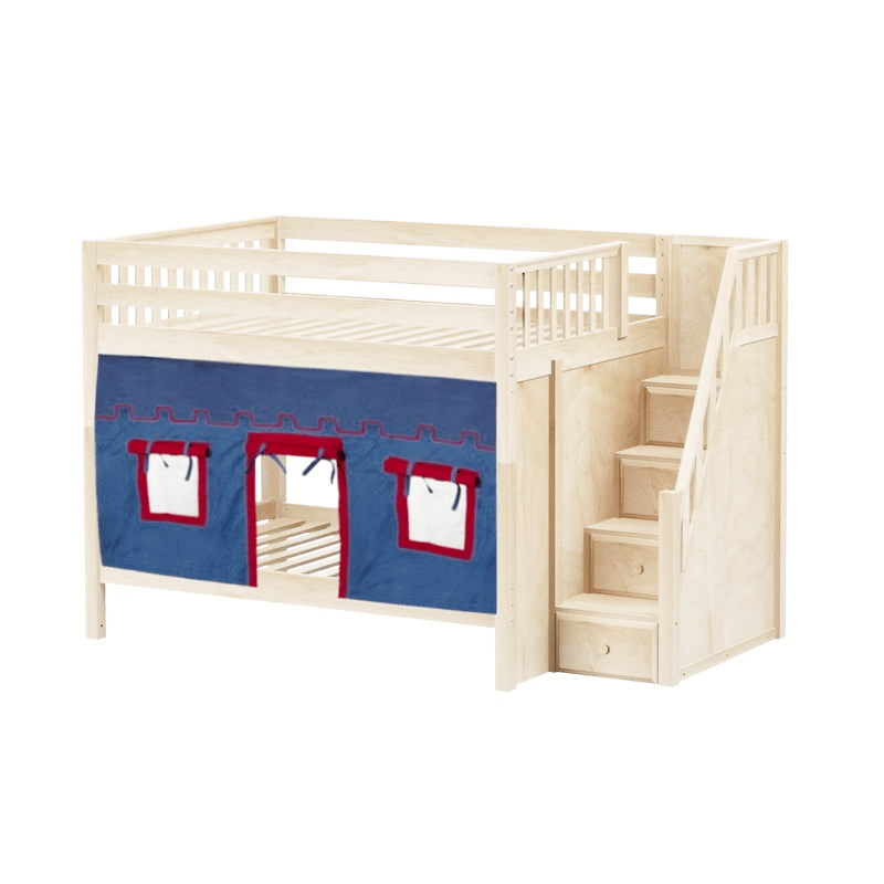Our medium bunk with staircase gets a super fun makeover when we add colorful curtains! Stairs are a safe way to climb into bed, plus steps double storage drawers. Full size = extra room for growing kids, sleepovers or snuggling with parents.
