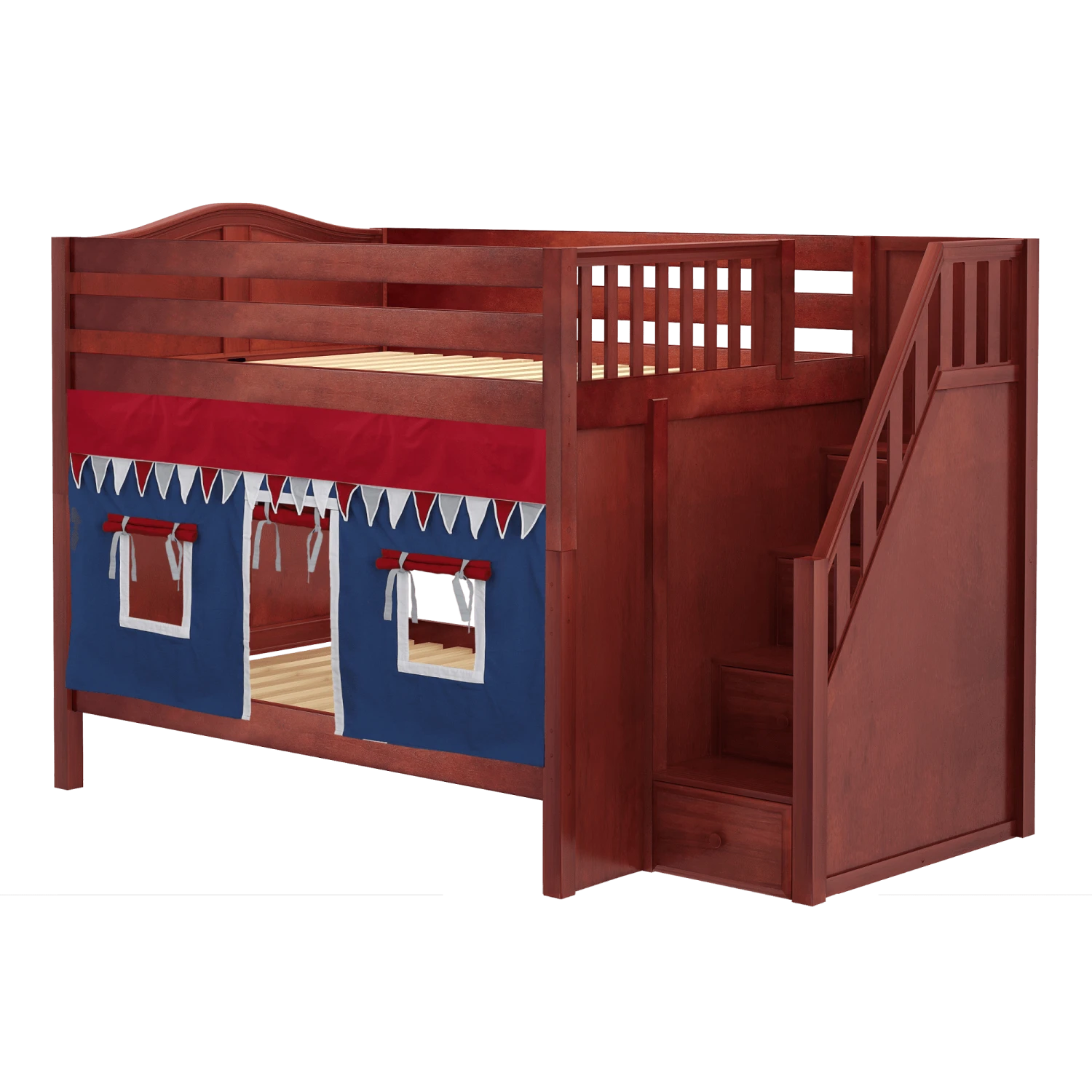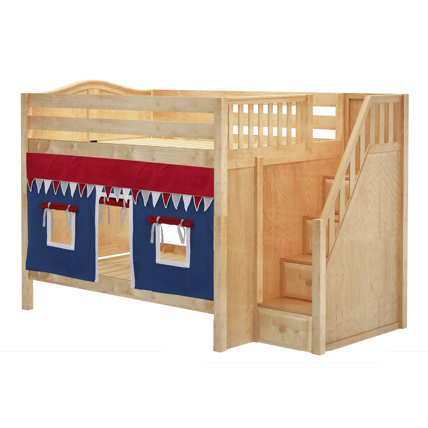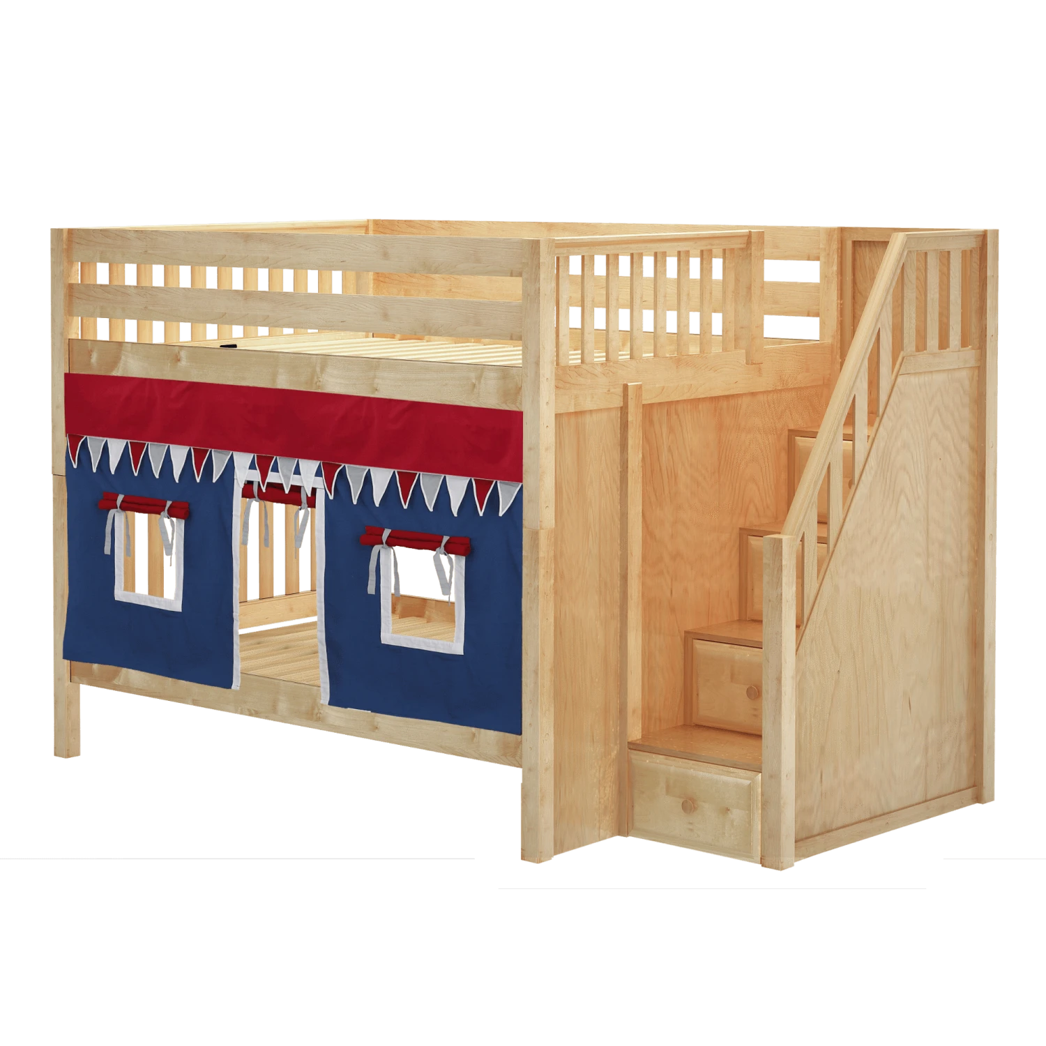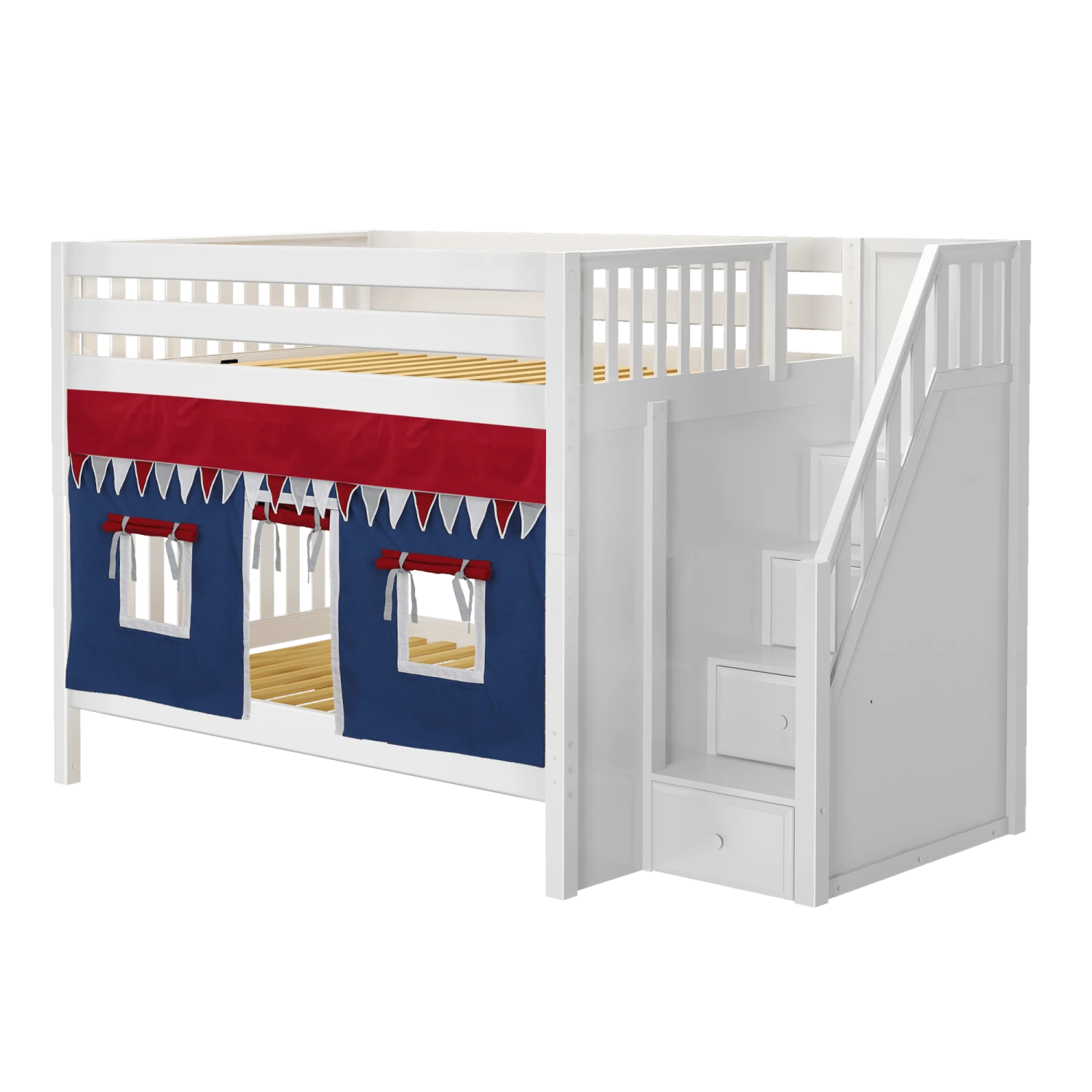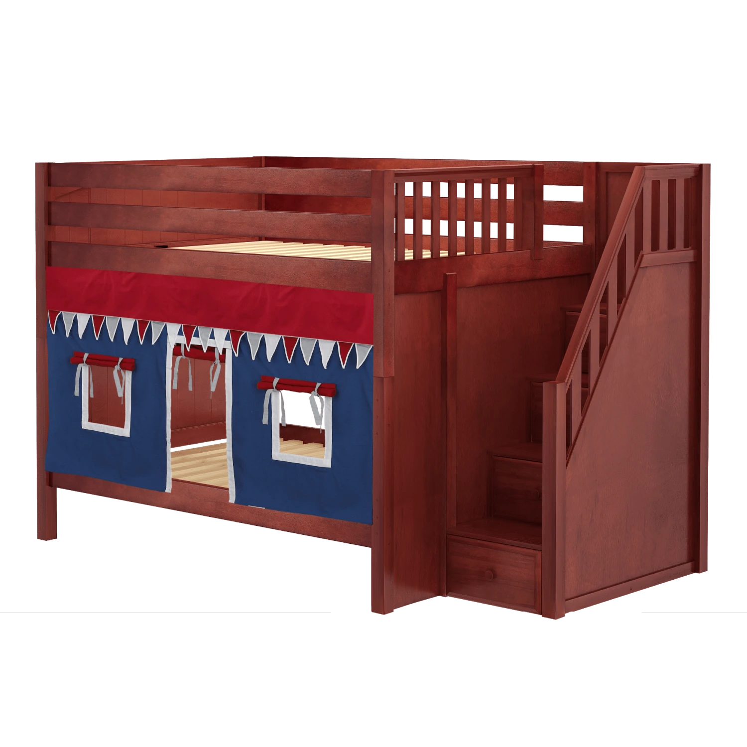 Our medium bunk with staircase gets a super fun makeover when we add colorful curtains! Stairs are a safe way to climb into bed, plus steps double storage drawers. Full size = extra room for growing kids, sleepovers or snuggling with parents.