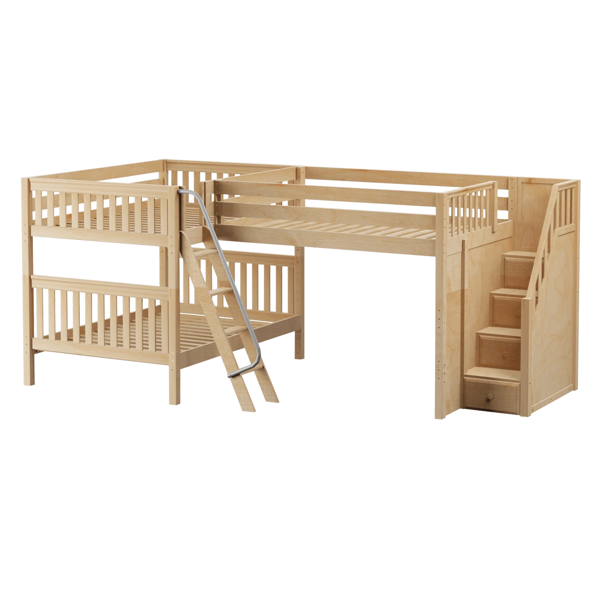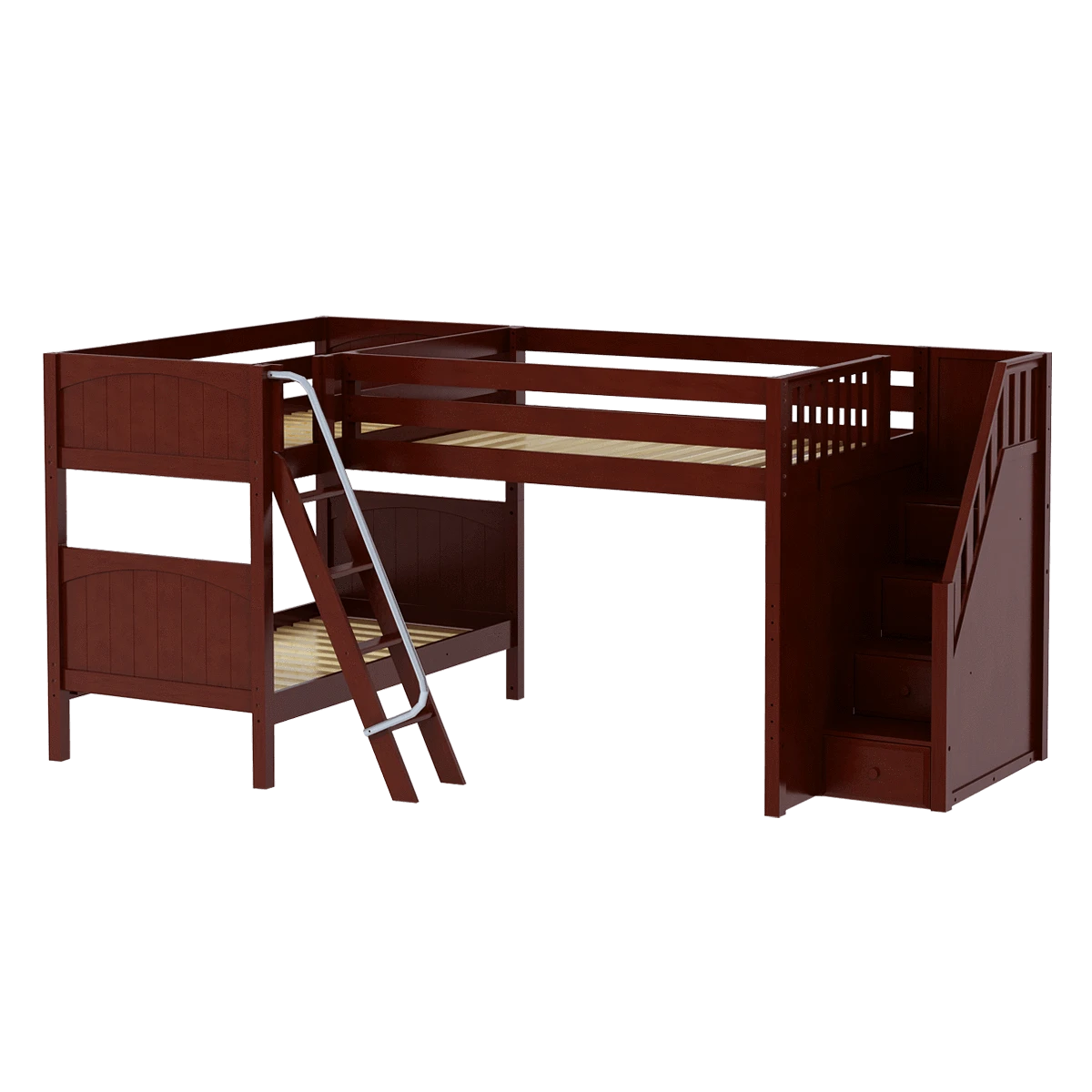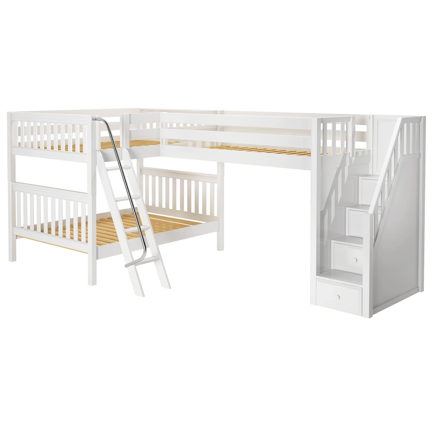Sleep 3 without sacrificing all of your floorspace! We combined a full-size bunk bed + twin-size loft bed in a unique “L” shape that fits perfectly in the bedroom corner. Staircase is safe and easy to climb, plus each step doubles as a storage drawer. Full size = extra room for growing kids, sleepovers or snuggling.