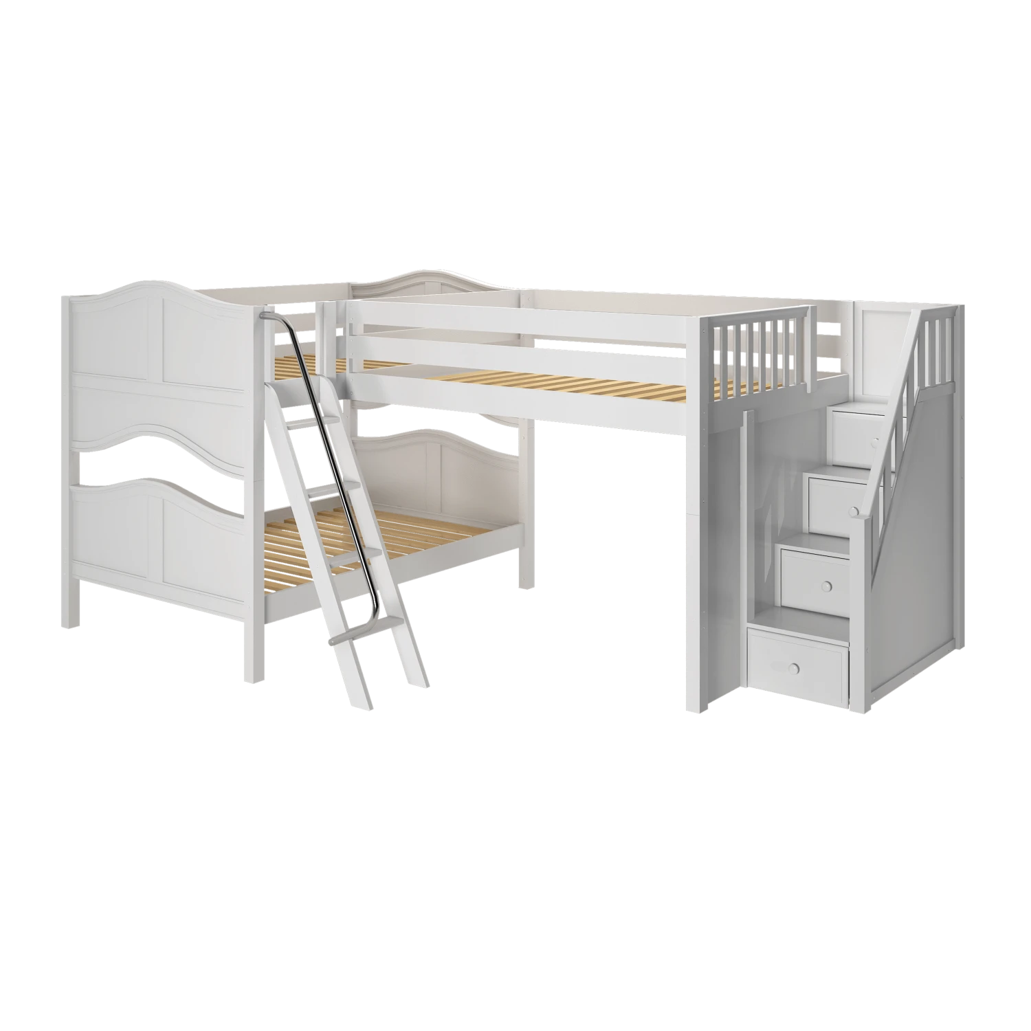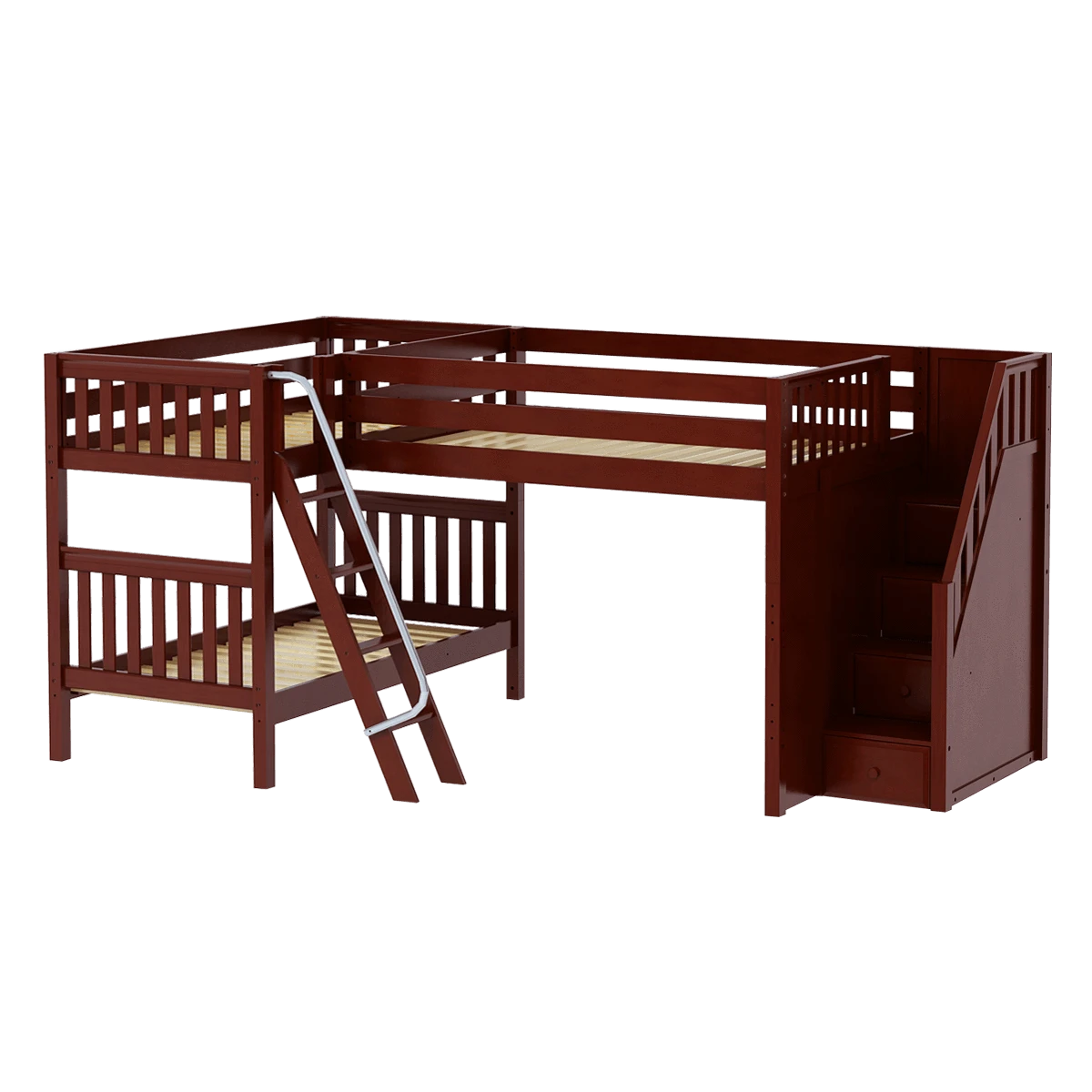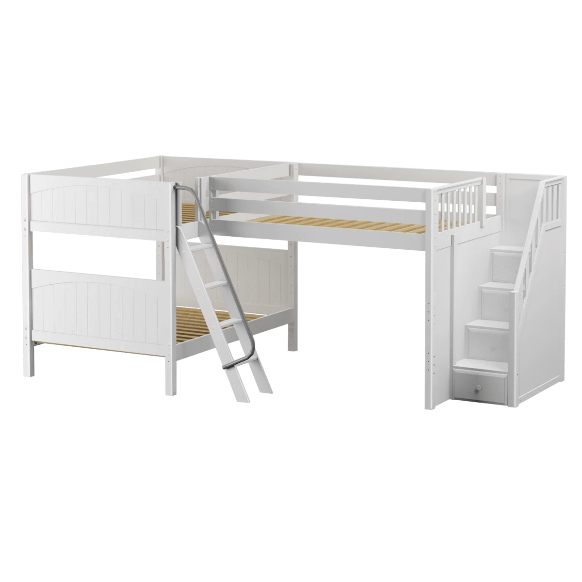 Sleep 3 without sacrificing all of your floorspace! We combined a full-size bunk bed + twin-size loft bed in a unique “L” shape that fits perfectly in the bedroom corner. Staircase is safe and easy to climb, plus each step doubles as a storage drawer. Full size = extra room for growing kids, sleepovers or snuggling.