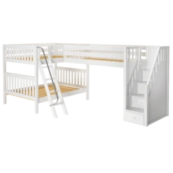 Our corner loft bunk is just that – two full size beds stacked on one side connected to a single twin size raised bed on the other. The result is a super functional “L” shape that fits perfectly in your bedroom corner.