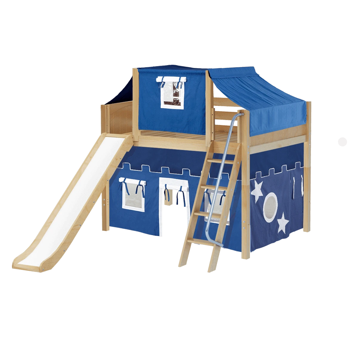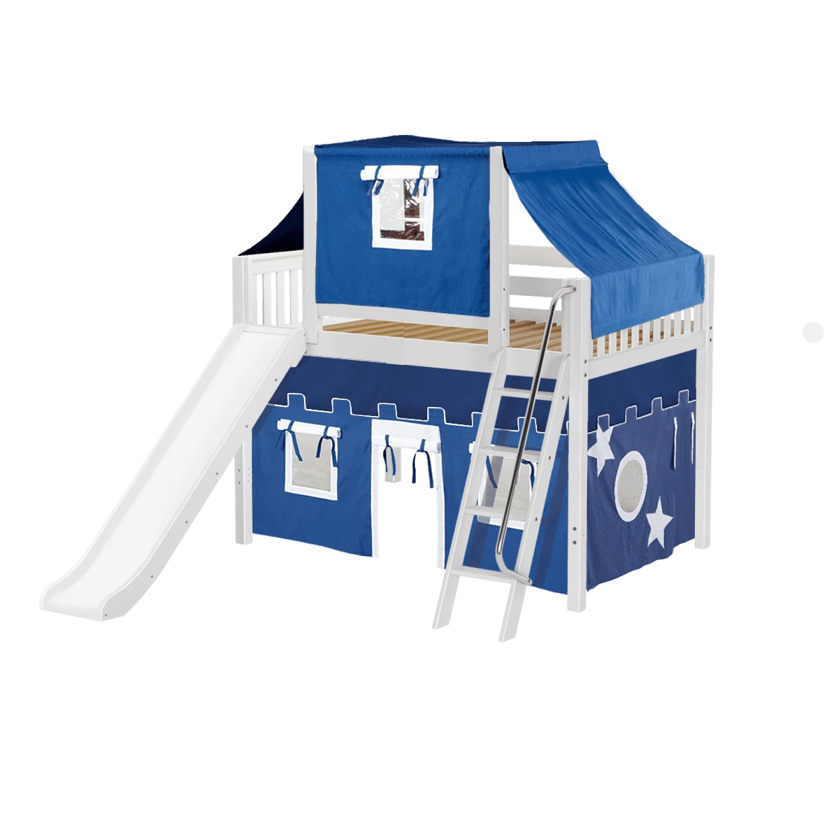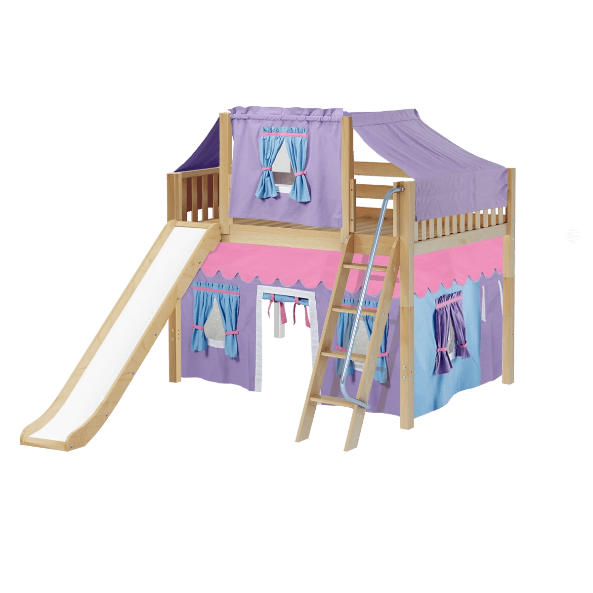 Our classic mid loft gets an extra dose of fun with the addition of colorful fabrics and a slide. Curtains + matching top tent will inspire your child’s imagination during the day, then help them sleep soundly at night. Full size = extra room for growing kids, sleepovers or snuggling.