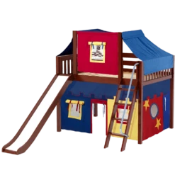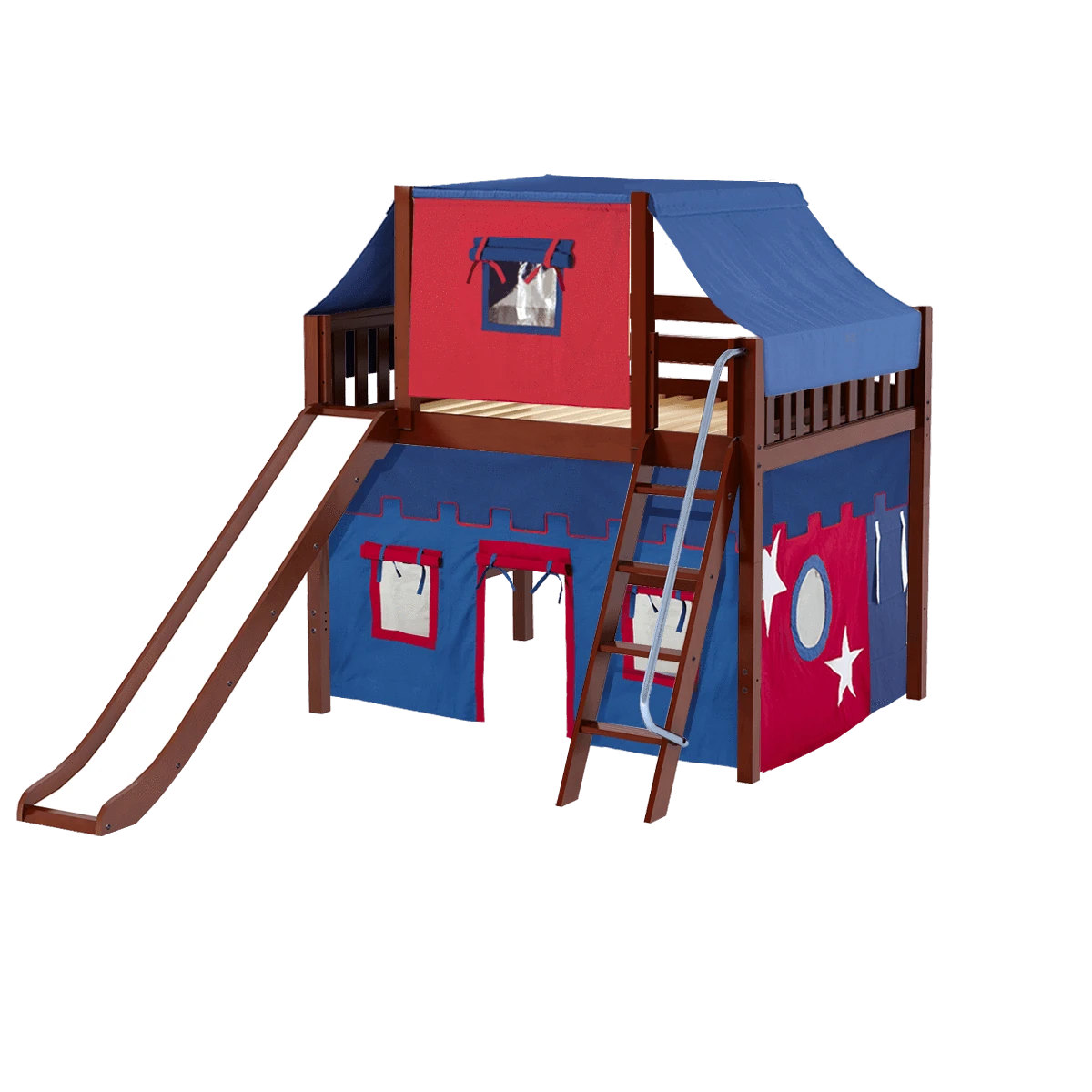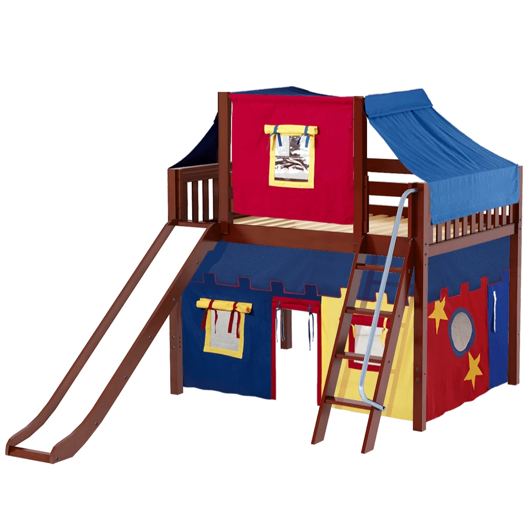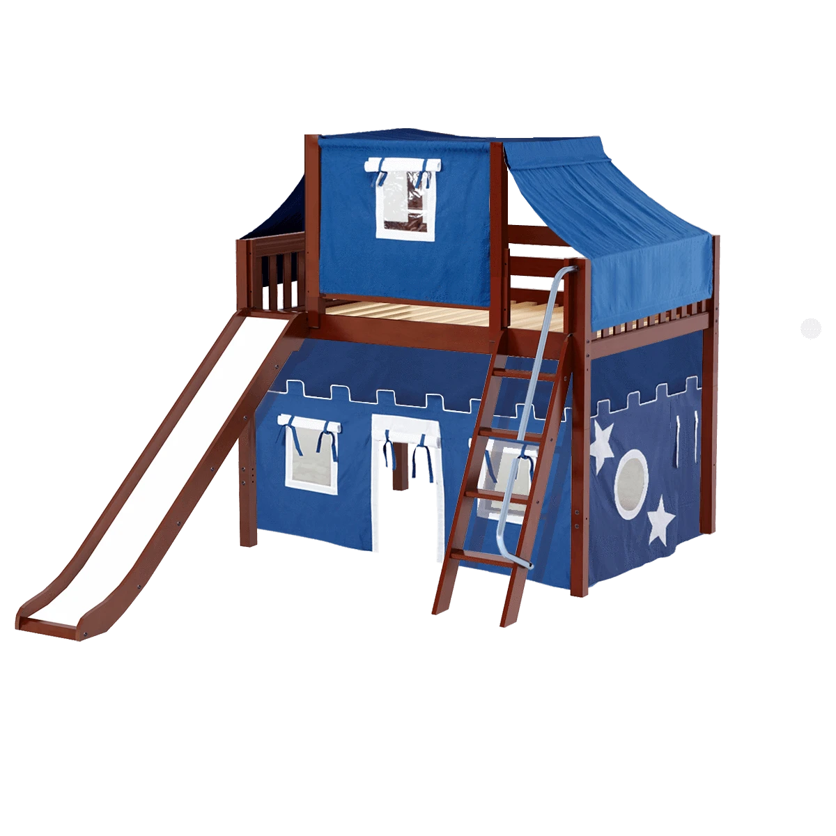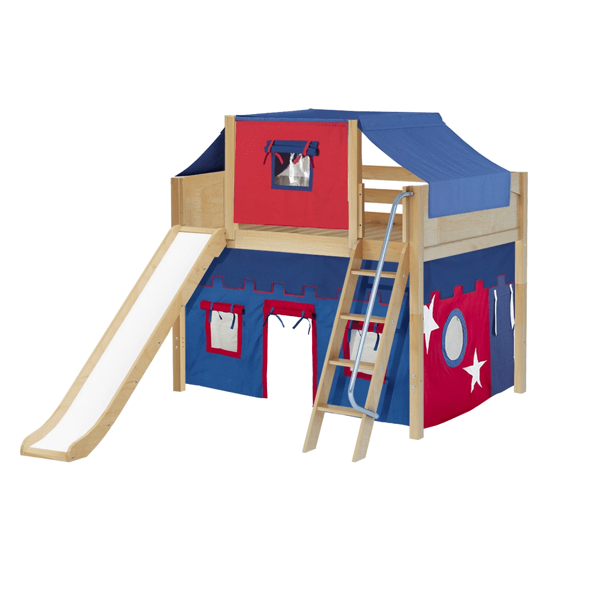 Our classic mid loft gets an extra dose of fun with the addition of colorful fabrics and a slide. Curtains + matching top tent will inspire your child’s imagination during the day, then help them sleep soundly at night. Full size = extra room for growing kids, sleepovers or snuggling.