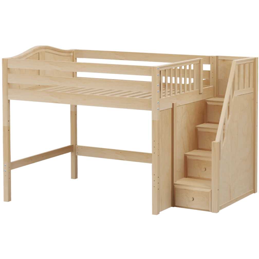 Raised high enough for ample underbed space (10+ inches than the low loft!), but still suitable for younger children and low ceilings, our popular mid loft bed with stairs works for all.