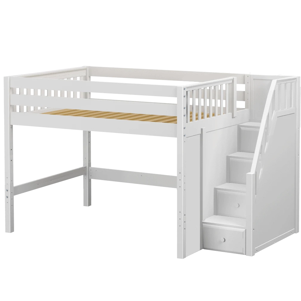 Space for sleep, study and play all one place makes this the ultimate combination of fun and function. Sturdy, easy to climb steps double as storage drawers, great for clothes or toys. More underbed space, but not too high, our popular full Mid Loft with staircase = the perfect happy medium!