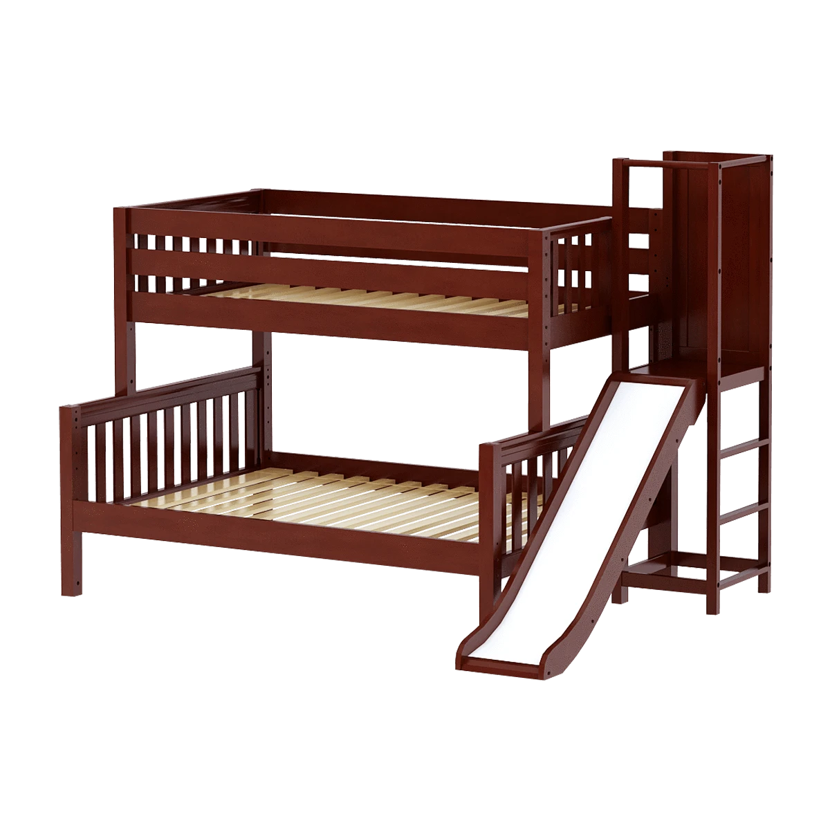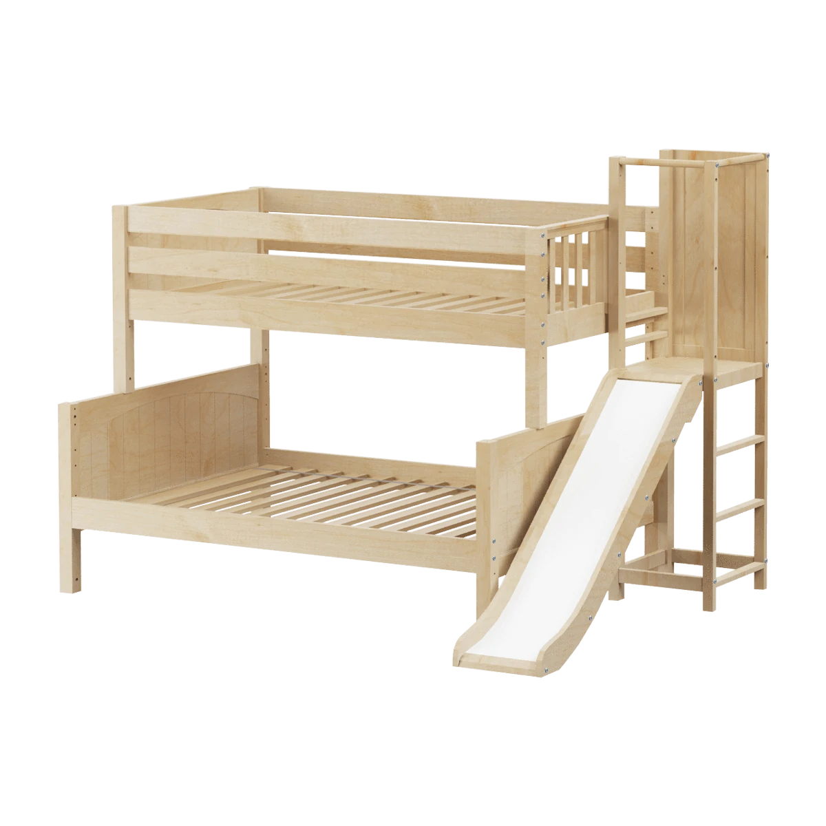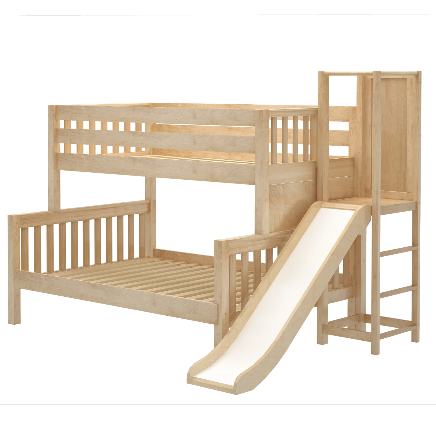 We added a slide to our classic twin over full bunk bed for the ultimate combination of fun and function. Staggered design sleeps different sizes and ages comfortably in one room. Platform at the bed end doubles as entry way to top.