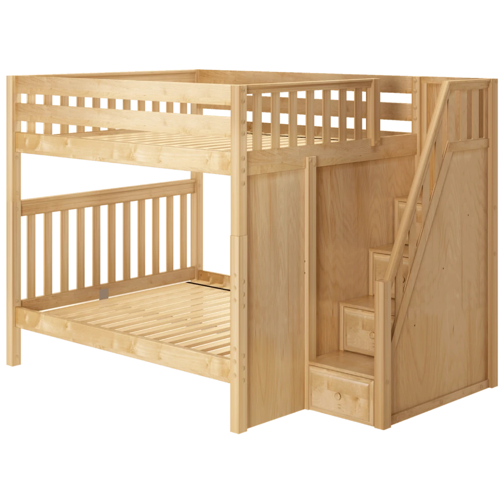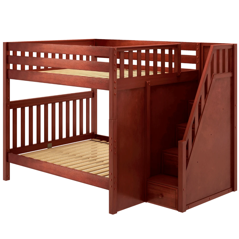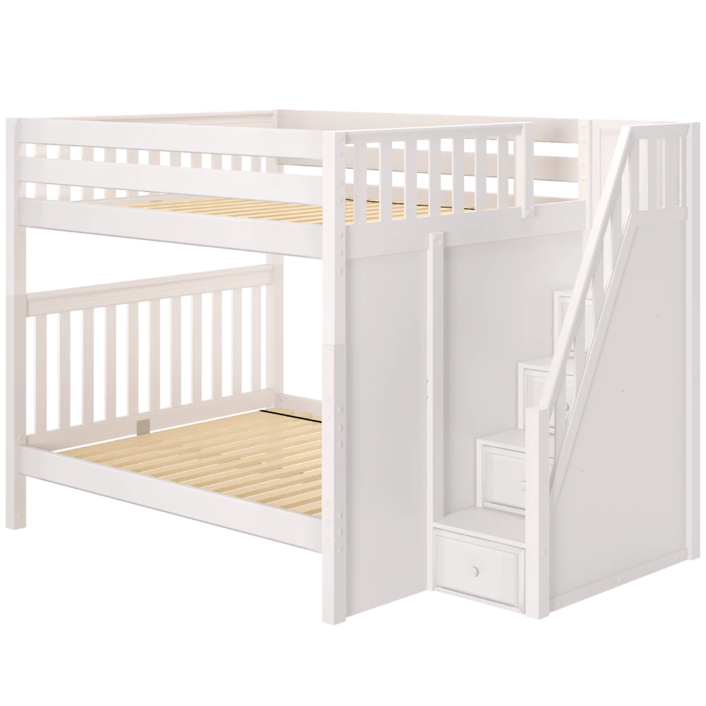 With 3.5 ft of space between top and bottom, our high bunk bed ensures no more bumped heads! Queen size = extra room for growing kids, or adult overnight guests. Stairs are a safe way for young children to climb into bed + sturdy enough for grown ups. Added bonus – steps double as storage drawers.
