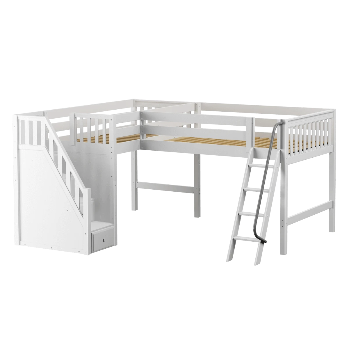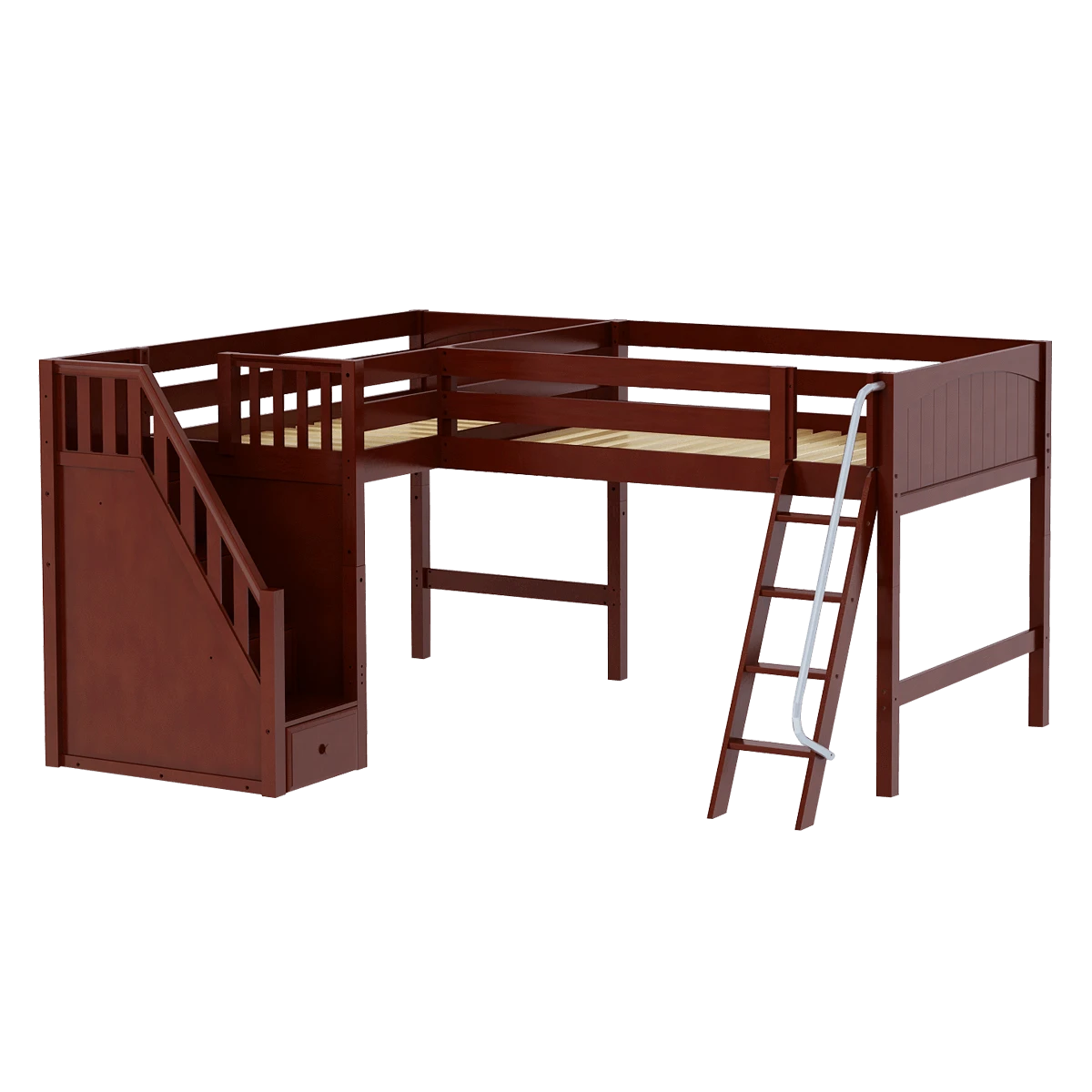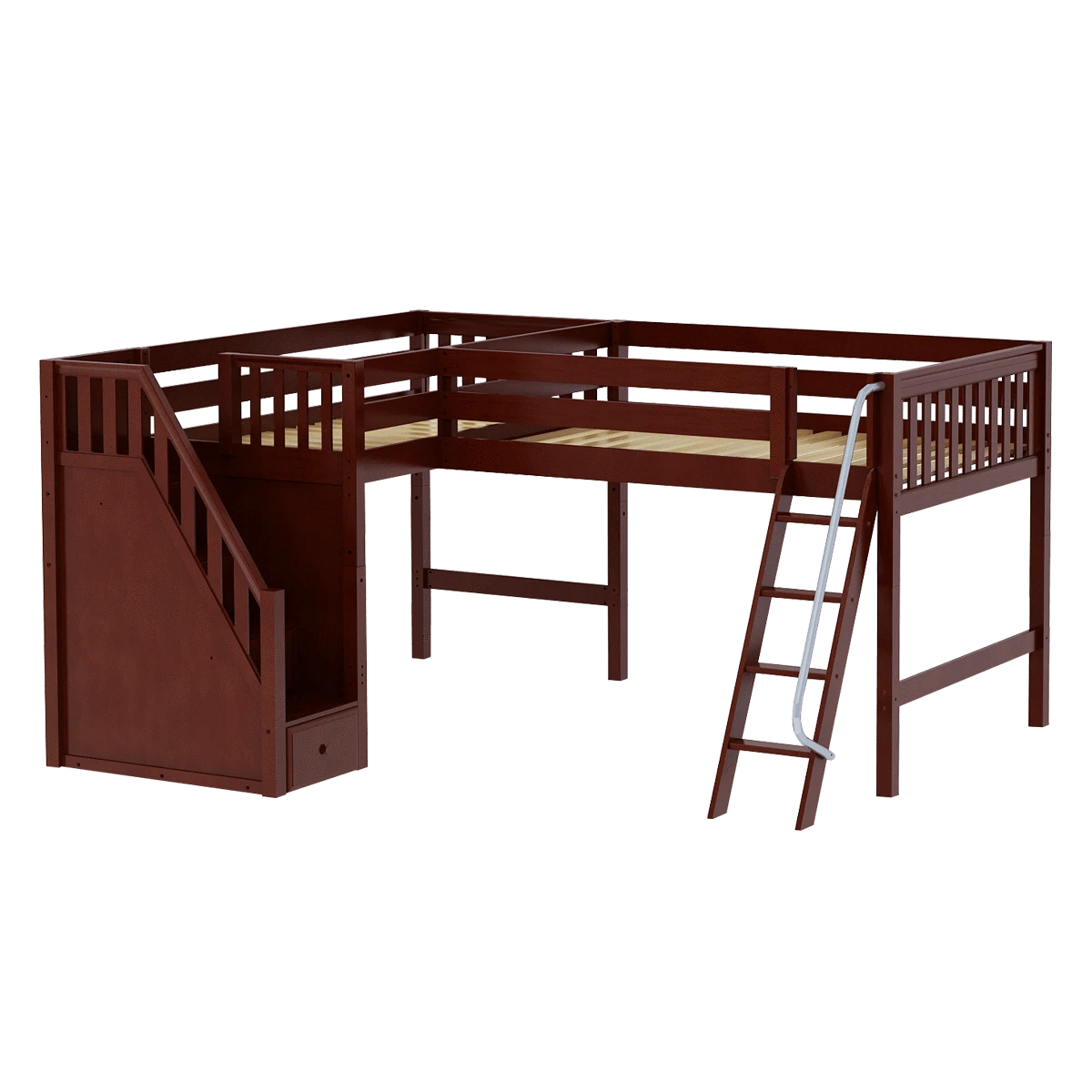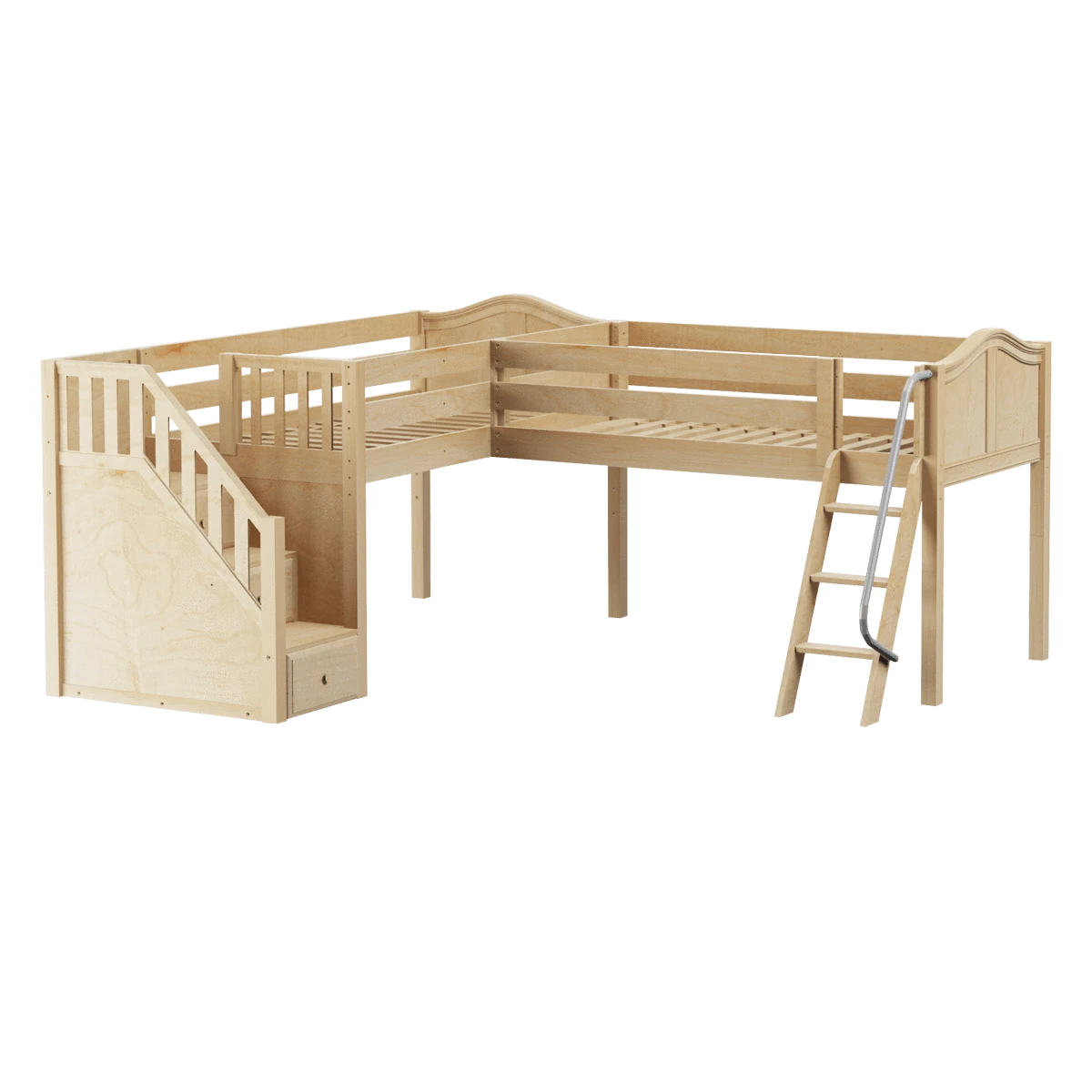 Raised “L” shape fits perfectly in a bedroom corner for a unique way to sleep two. Full bed with staircase on one side is connected to a twin size bed + angled ladder on the other. Added bonus, staircase steps double as drawers for built in storage! Loft design frees up valuable floorspace.