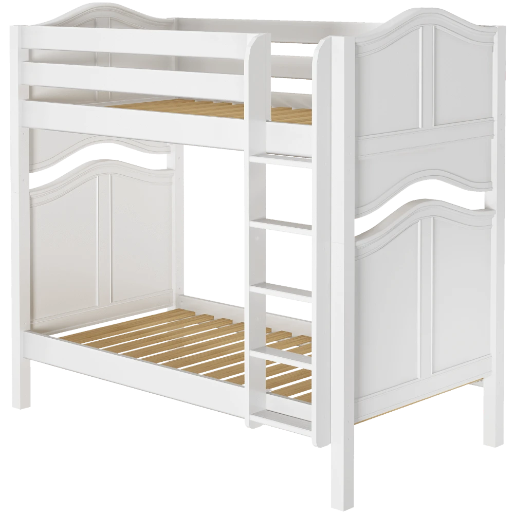 Avoid bumped heads with the Maxtrix high bunk bed! 3.5 ft of space between top and bottom allows teens + adults to sit up comfortably. Two twin beds are stacked using patented Rock Lock system to form one solid unit. Choose space-saving straight ladder or extra-safe angle ladder.