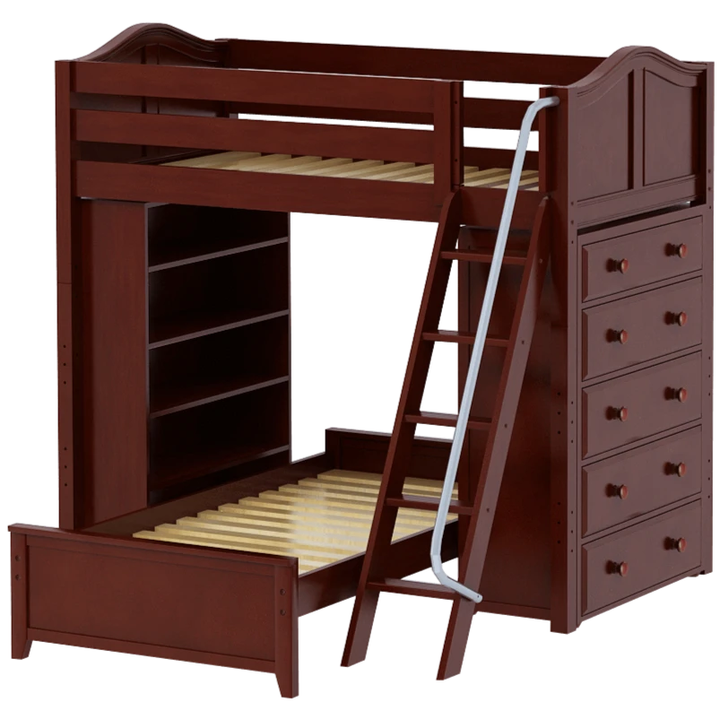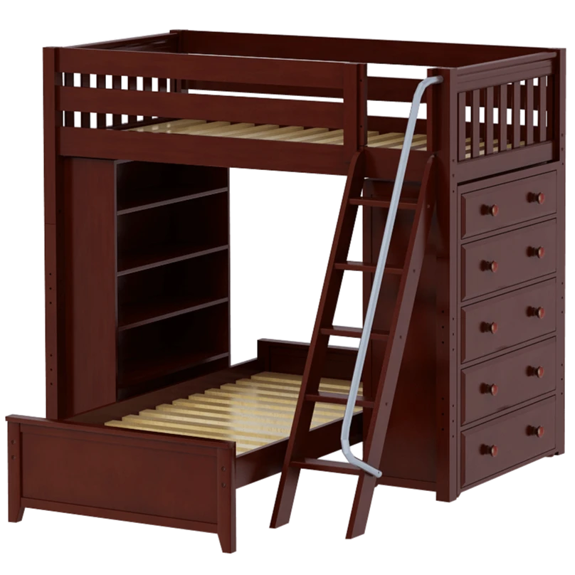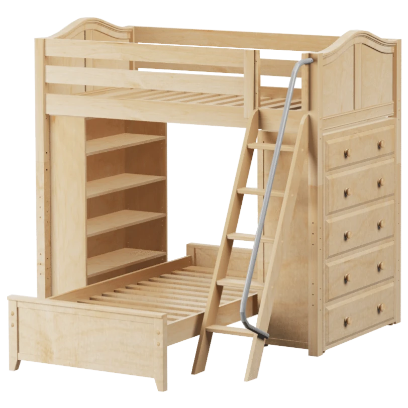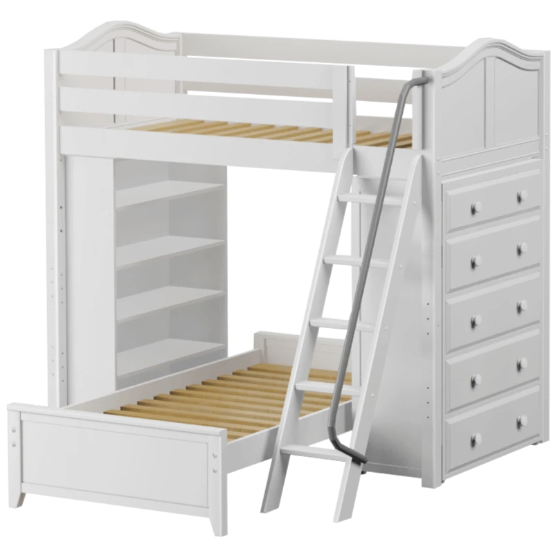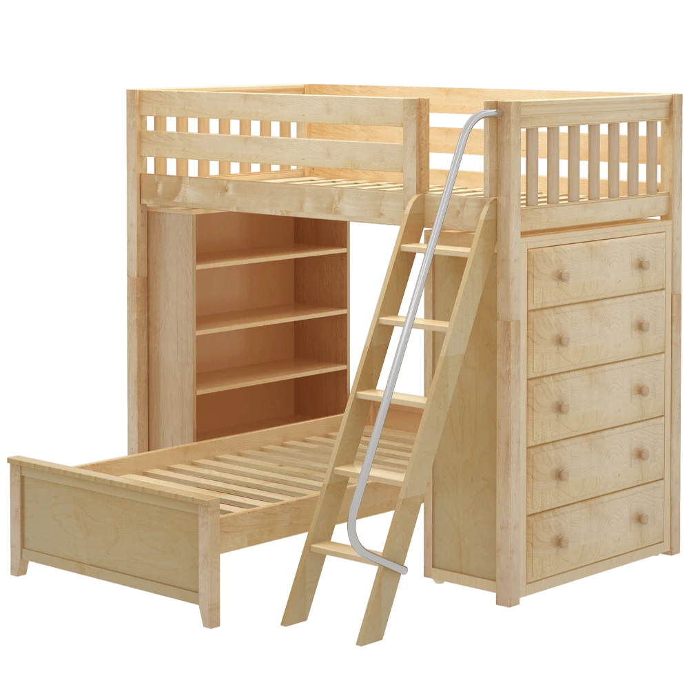 The ultimate all-in-one solution for your child’s bedroom! Lofted bed makes room for another bed to slide in below perpendicular. Our perfectly sized bookcase on one end, and dresser on the other add much needed storage without losing valuable floorspace.
