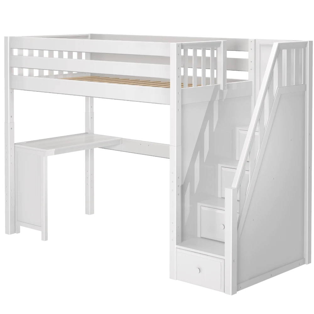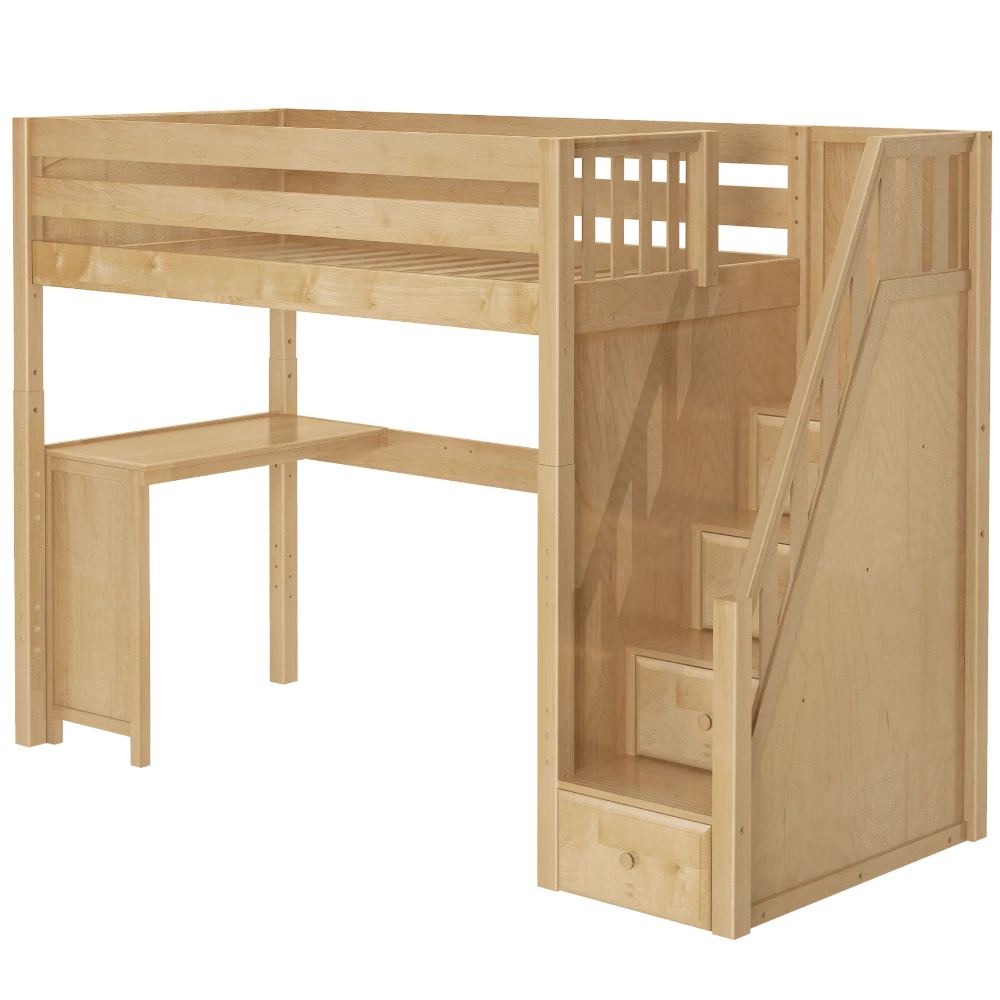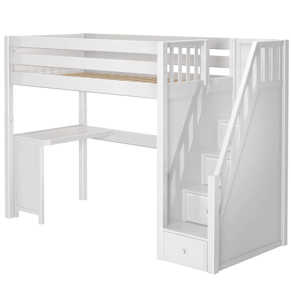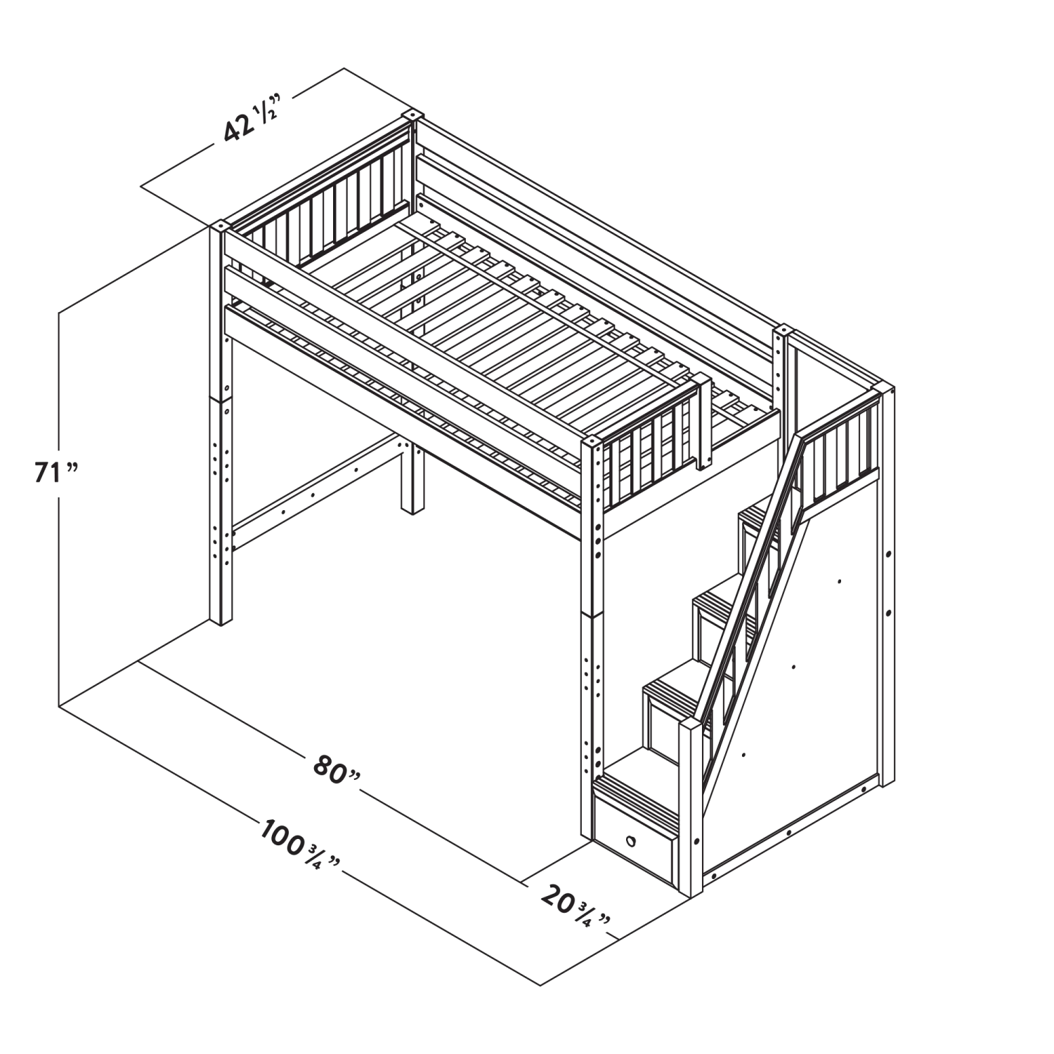 Our high loft with stairs becomes the ultimate sleep + study combo! Attached matching desk creates a functional spot for schoolwork and frees up valuable floorspace in your child’s bedroom. Easy to climb staircase steps double as storage drawers.