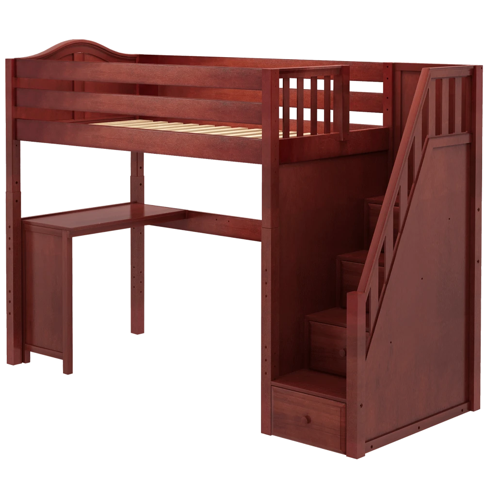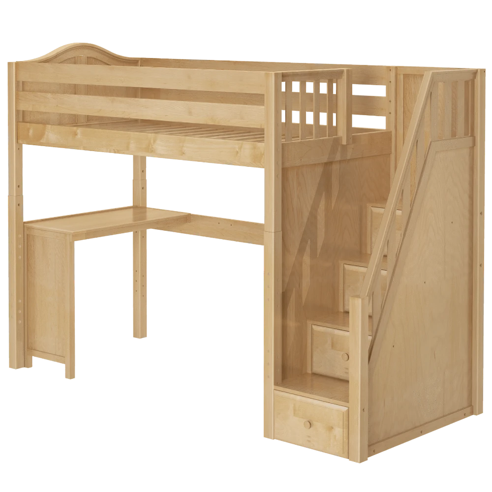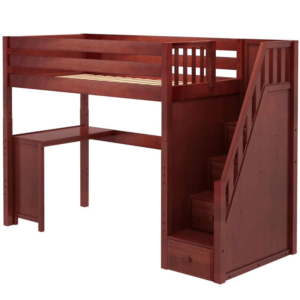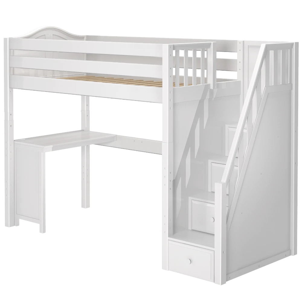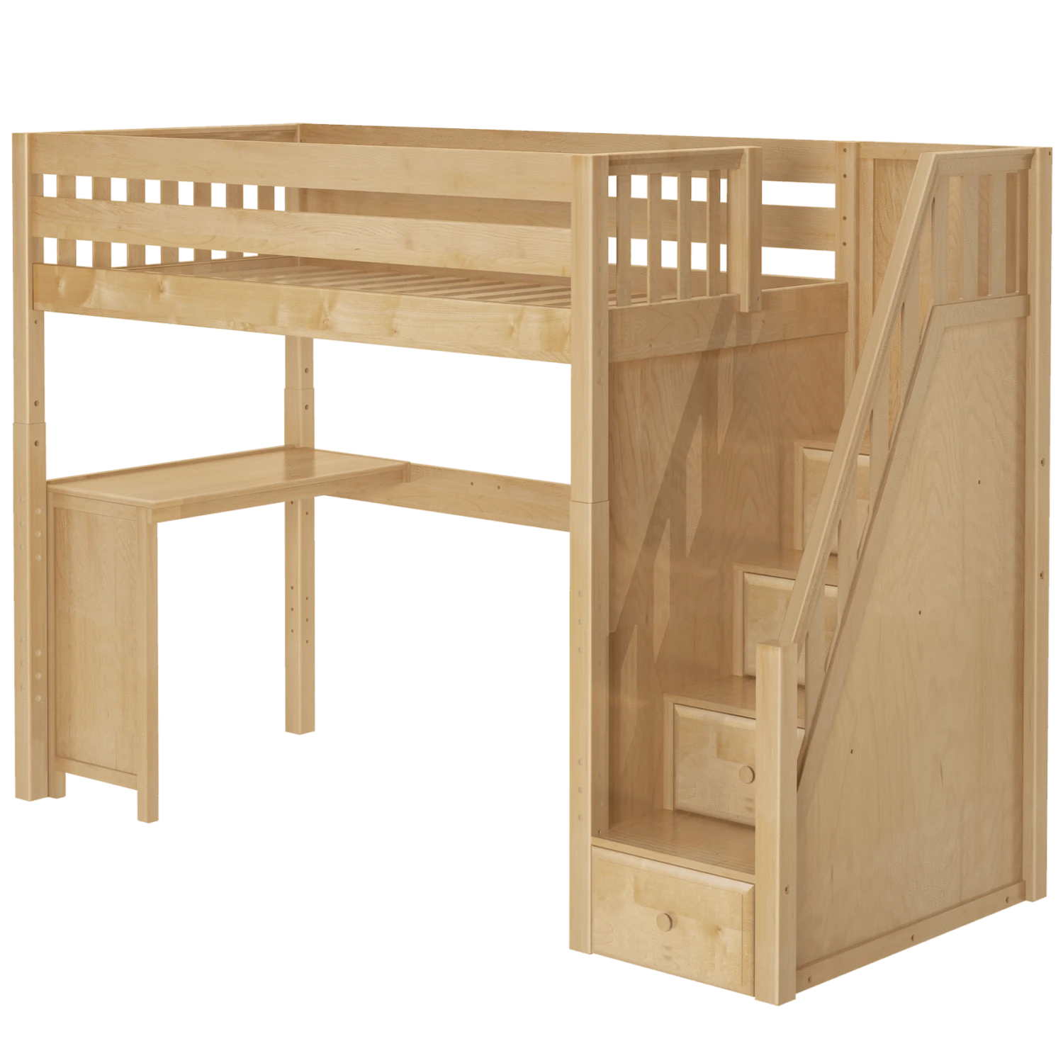 Our high loft with stairs becomes the ultimate sleep + study combo! Attached matching desk creates a functional spot for schoolwork and frees up valuable floorspace in your child’s bedroom. Easy to climb staircase steps double as storage drawers.