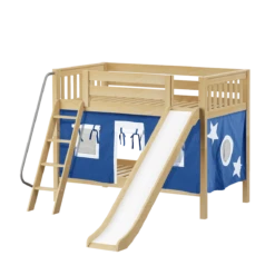 We added colorful curtains + slide to our classic low bunk, creating an adorable playhouse bed. Stacked design sleeps two comfortably – low height is perfect for small rooms and little ones. Angled ladder with sturdy handrail sticks out from bed at a slant for easy, comfortable climbing.