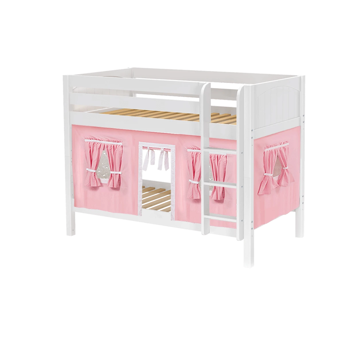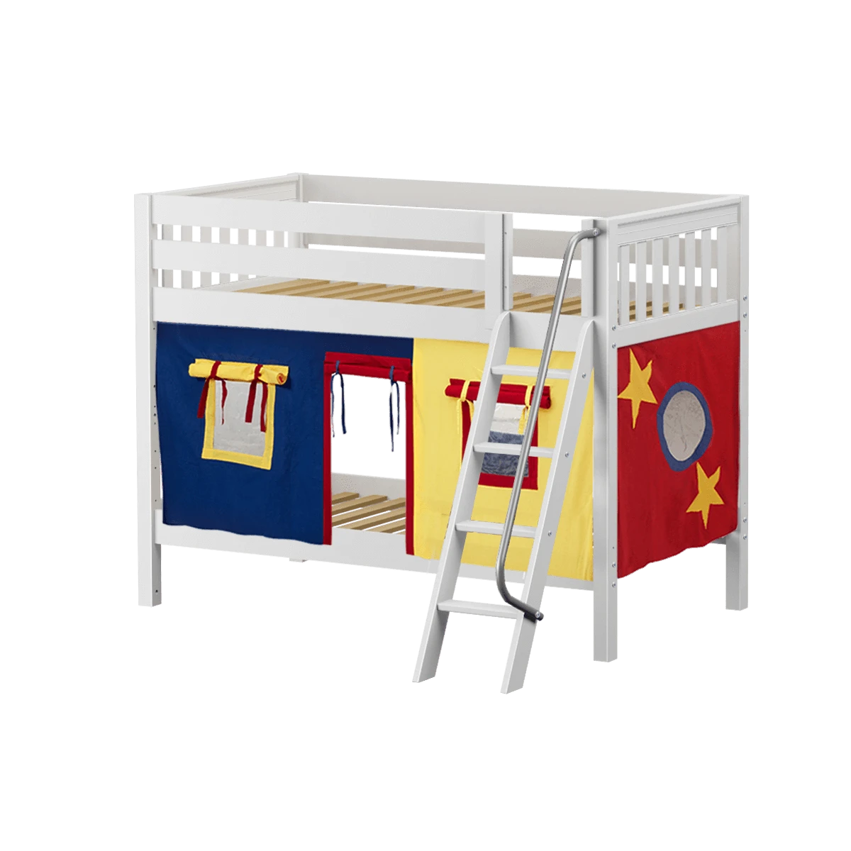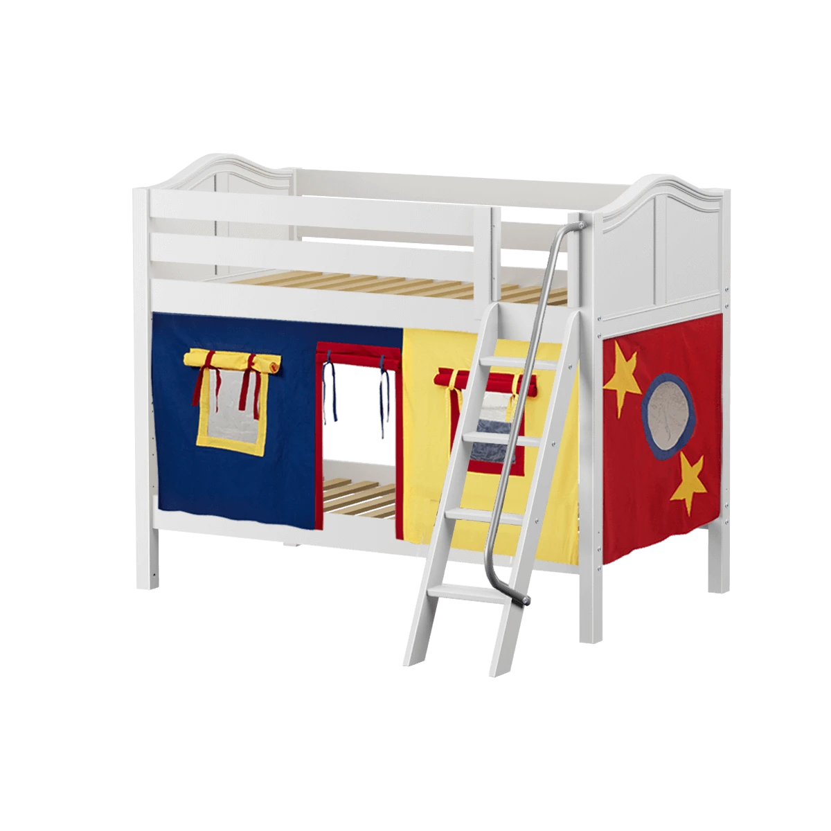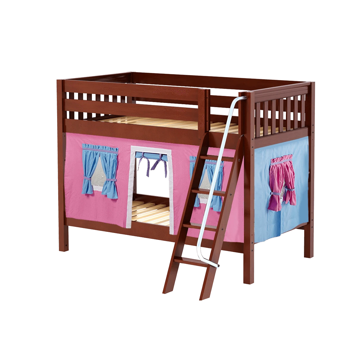 We added colorful fabric curtains to our classic low bunk to create an adorable playhouse bed. Angled ladder + sturdy handrail sticks out from bed at a slant for easy, comfortable climbing. Stacked design is a space-saving way to sleep two in one bedroom.