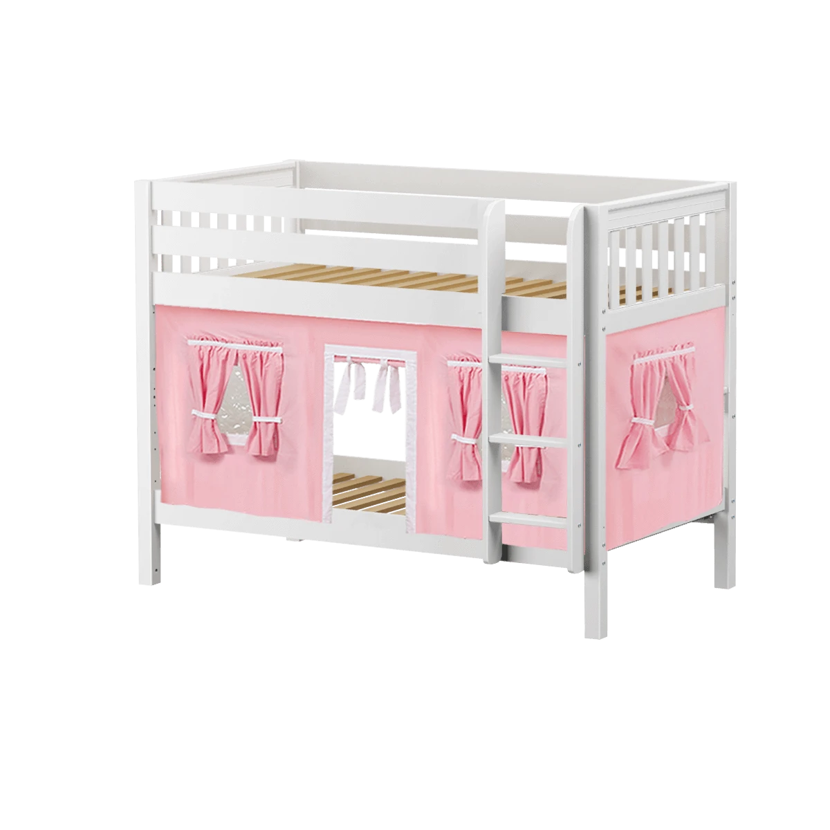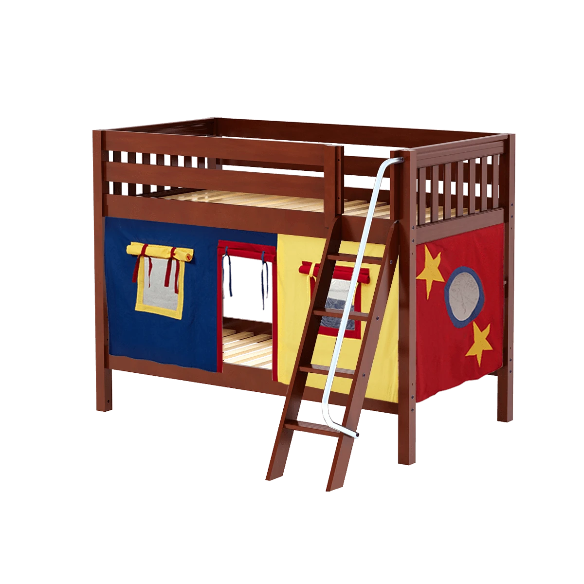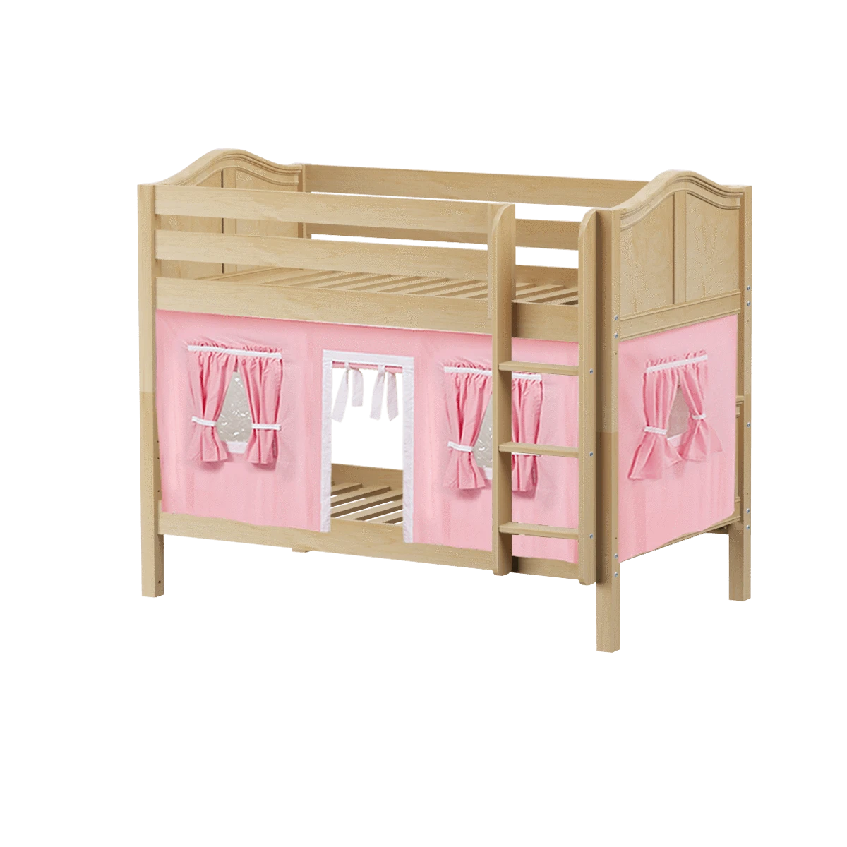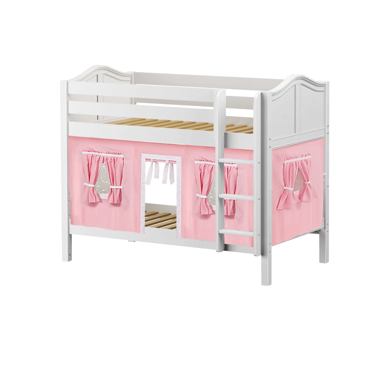 We added colorful fabric curtains to our classic low bunk to create an adorable playhouse bed. Angled ladder + sturdy handrail sticks out from bed at a slant for easy, comfortable climbing. Stacked design is a space-saving way to sleep two in one bedroom.