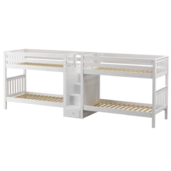 This Quadruple Bunk is two traditional Twin Medium Bunk Beds connected by a staircase in the middle. Designed as a space-saving way to sleep four, it’s the perfect solution for a shared bedroom or vacation home. Added bonus, stairs double as drawers for built in storage!