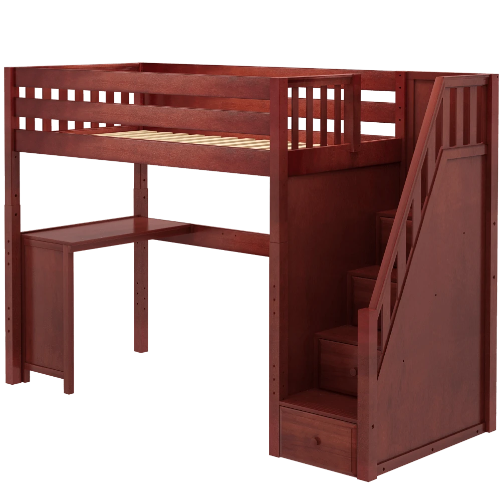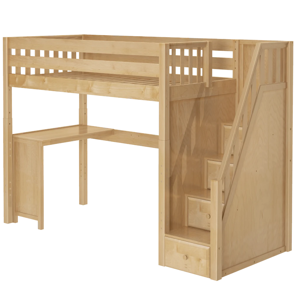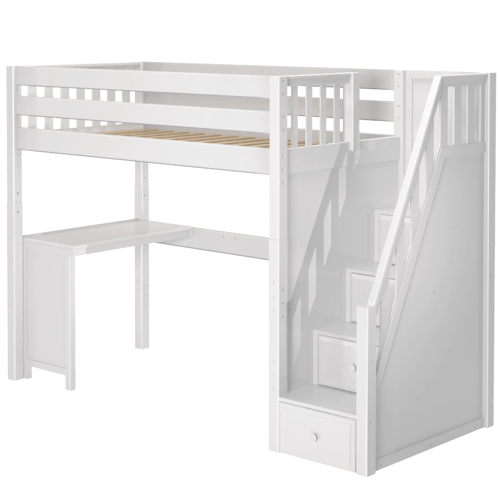 Our high loft with stairs becomes the ultimate sleep + study combo! Attached matching desk creates a functional spot for schoolwork and frees up valuable floorspace in the bedroom. Easy to climb staircase steps double as storage drawers. Now available in Twin XL size so there’s plenty of room to grow.