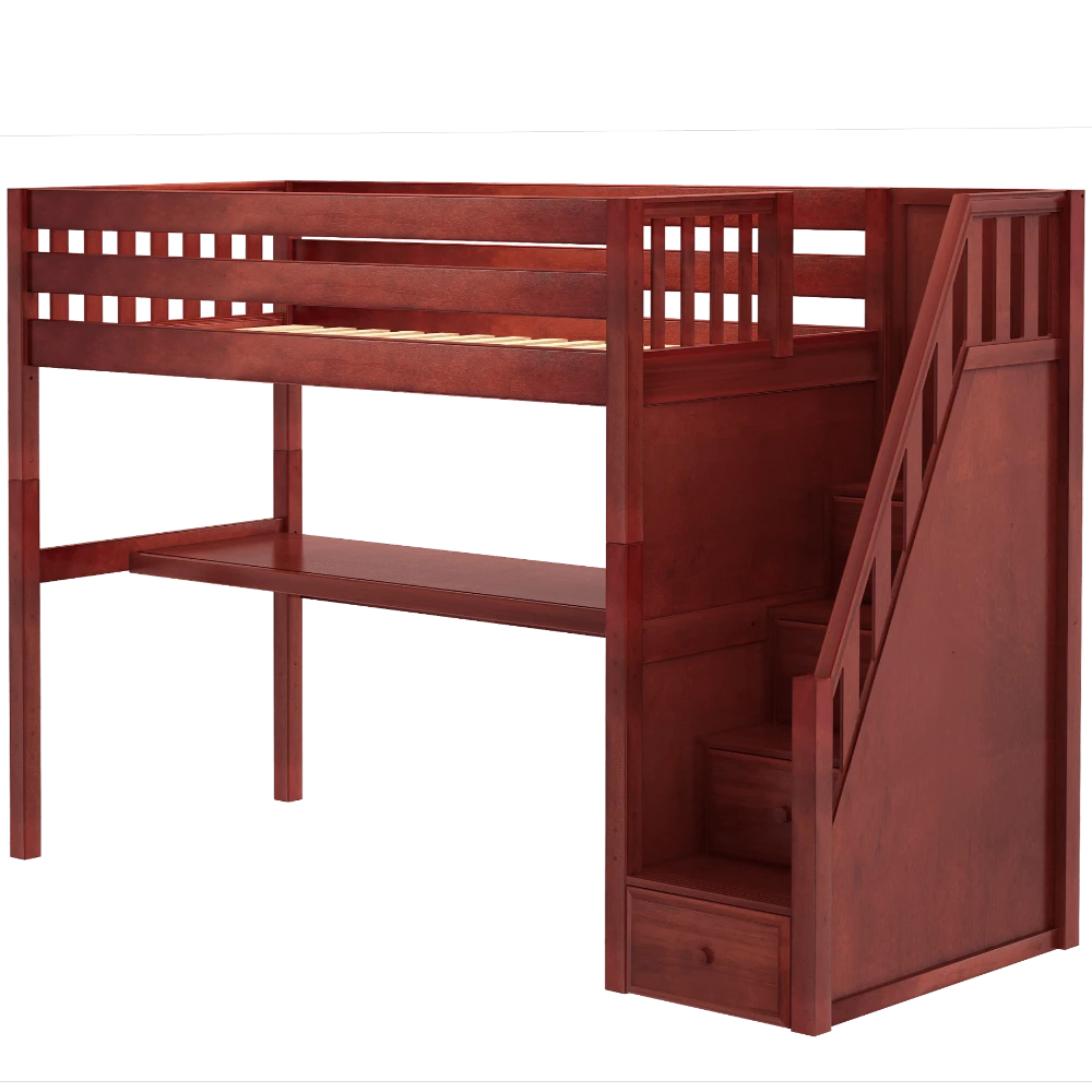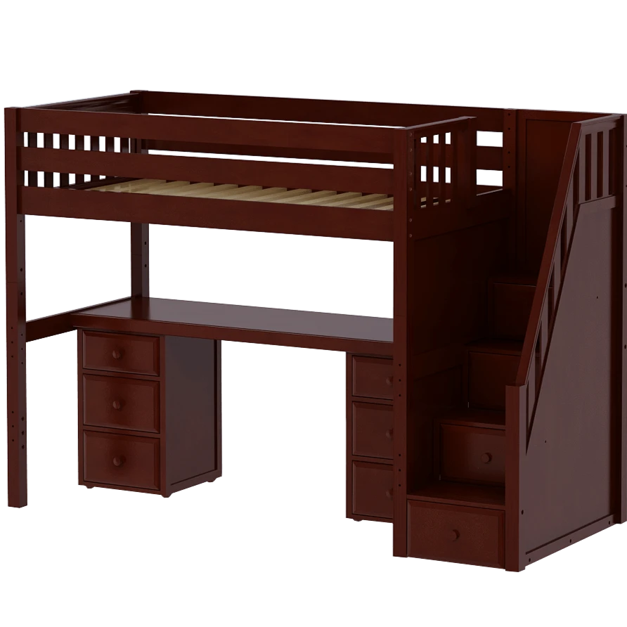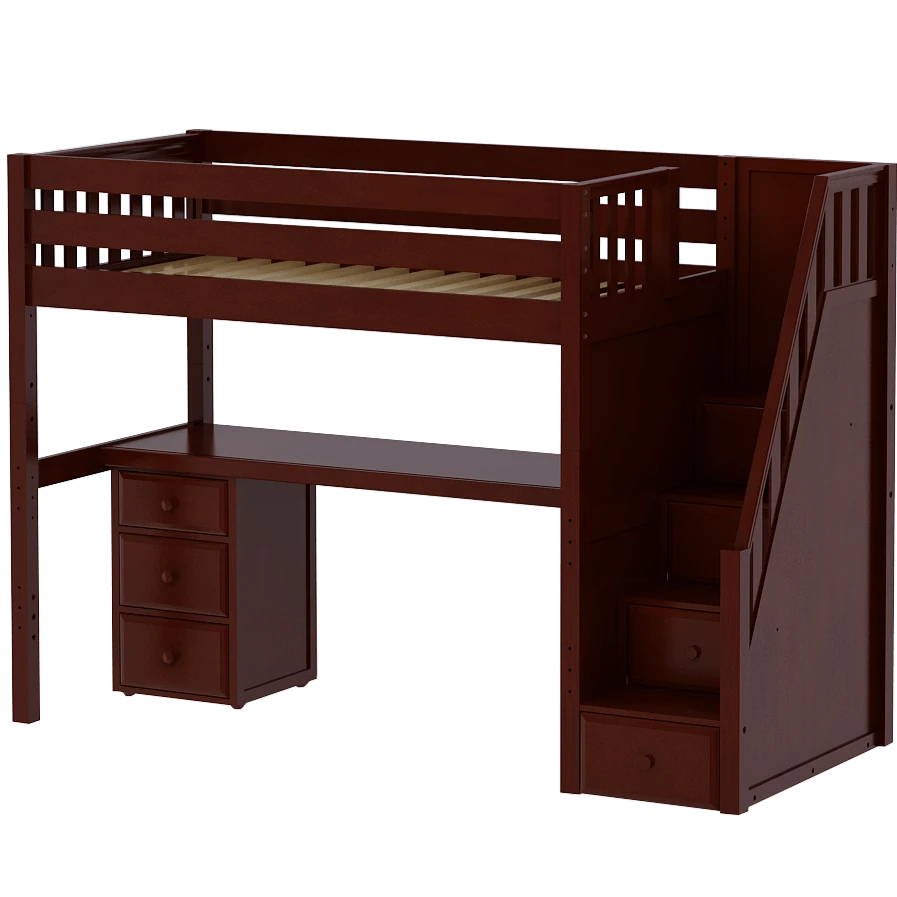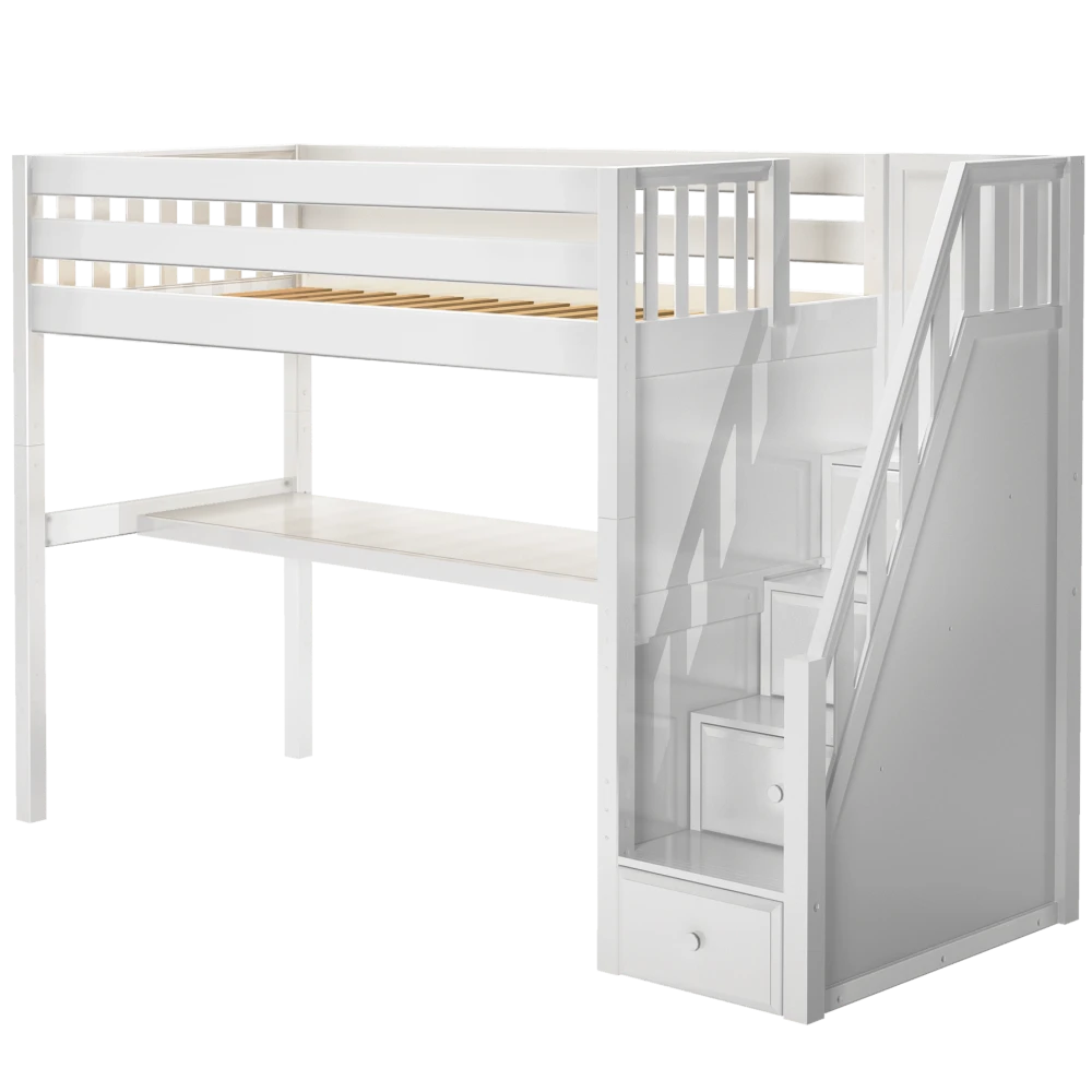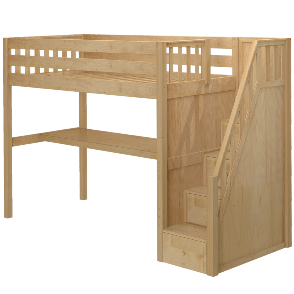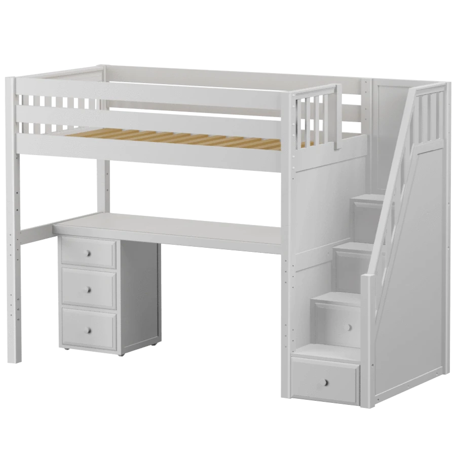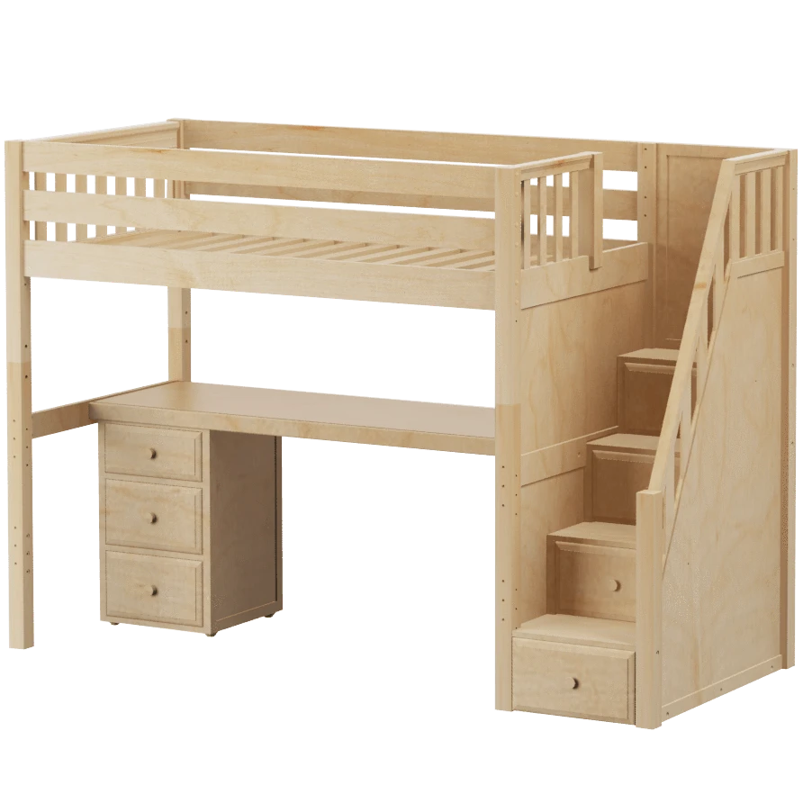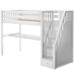 Our high loft with stairs becomes the ultimate sleep + study combo! Attached matching desk creates a functional spot for schoolwork and frees up valuable floorspace in the bedroom. Easy to climb staircase steps double as storage drawers. Now available in Twin XL size so there’s plenty of room to grow.